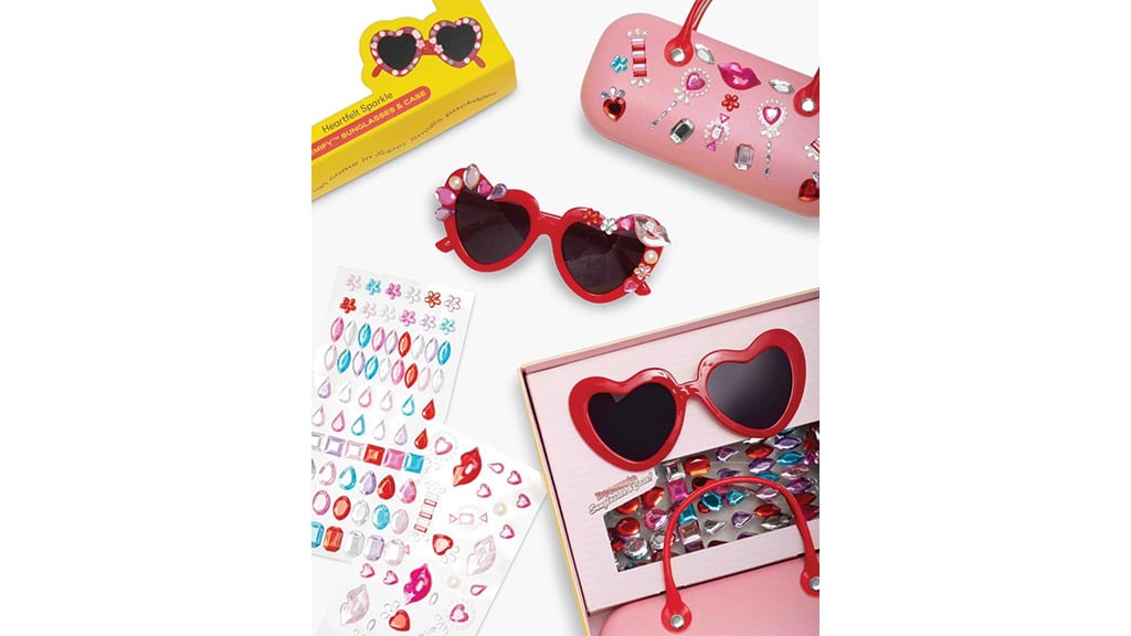 Ta komplet je hkrati ustvarjalna ročna dejavnost in bleščeč, modni dodatek. Otroci lahko po lastnem okusu okrasijo rdeča, v obliki srca oblikovana sončna očala z UVA/UVB zaščito ter roza torbico za prenašanje. Paket vsebuje več kot 100 nalepk v obliki srca, ustnic in bonbonov, bleščečih draguljev, tako da lahko vsak resnično unikatno okrasi svoj očala in etui. Ta komplet ne ponuja le zabavne dejavnosti, ampak razvija tudi ustvarjalnost in ročne spretnosti, medtem ko lahko otroci ponosno nosijo resnično stilski, lastnoročno izdelan modni dodatek.
