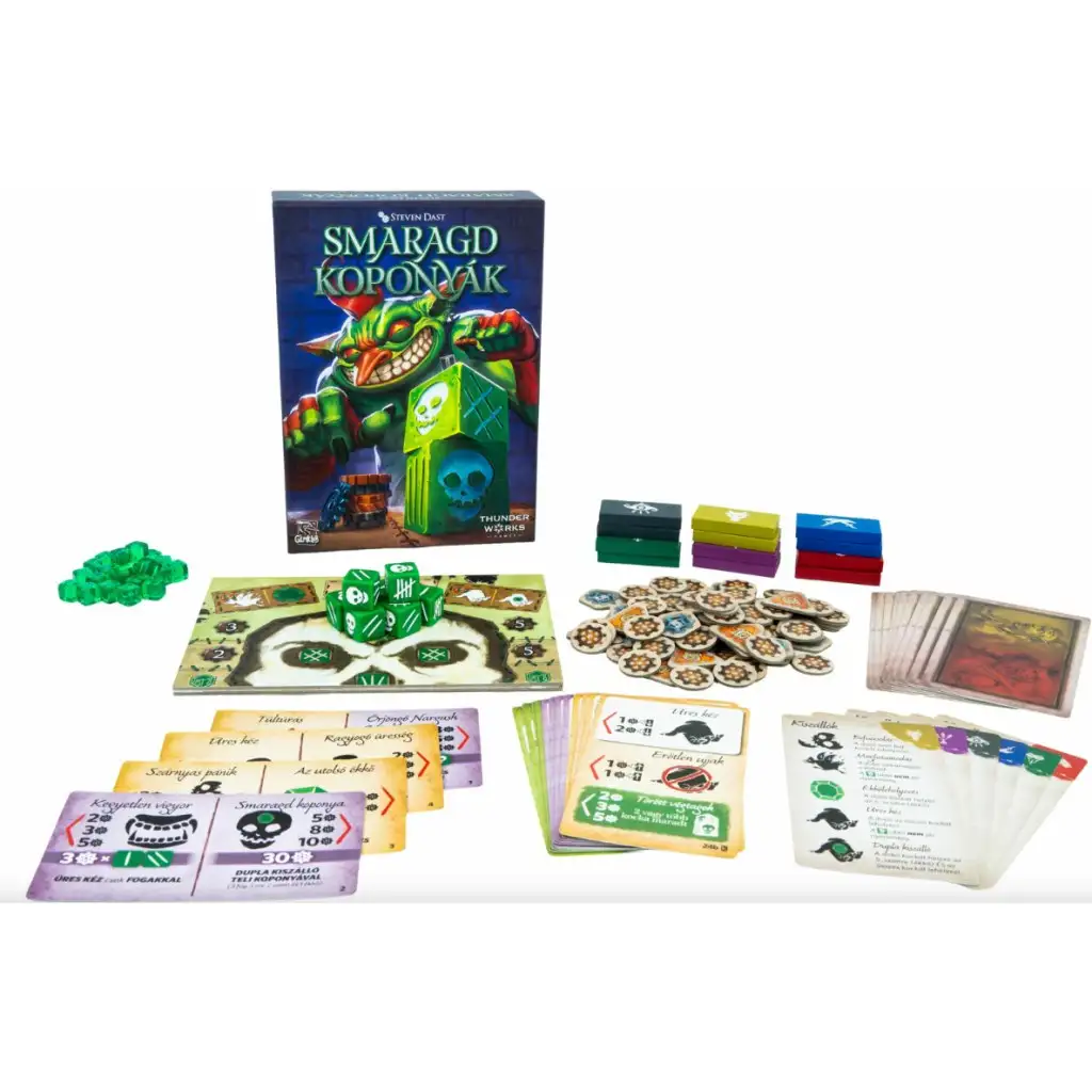 Smaragdne lobanje je razburljiva in polna preobratov igra na srečo, ki igralce popelje v temen, z zobniki napolnjen svet podzemnih hodnikov. Igralci preizkušajo svojo srečo pri legendarni metalski mizi goblina Nargasha, kjer udarci kock iz kosti in hitre stave določajo njihovo usodo. Cilj igre je, da položiš čim več kock na različne stopnje, ne da bi pri tem padel – na višje stopnje se lahko povzpneš le z natančnim metom, razporejanje pa je vedno taktična odločitev.