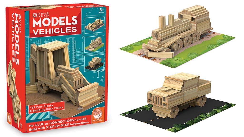 Otroci lahko iz več kot 150 natančno izrezanih KEVA gradbenih elementov sestavijo štiri vrste lesenih vozil – parno lokomotivo, bager, dirkalni avto in tovorno vozilo s kesonom. Lepilo ali priključki niso potrebni. Ta STEM-prijazen komplet vsebuje osnovne plošče in knjigo z navodili, ki pomaga razvijati kritično mišljenje in ustvarjalnost, medtem ko otroci gradijo, razstavljajo in ponovno ustvarjajo. Tako lahko ure in ure uživajo v ročni zabavi, medtem ko se igrajo, učijo in razvijajo.