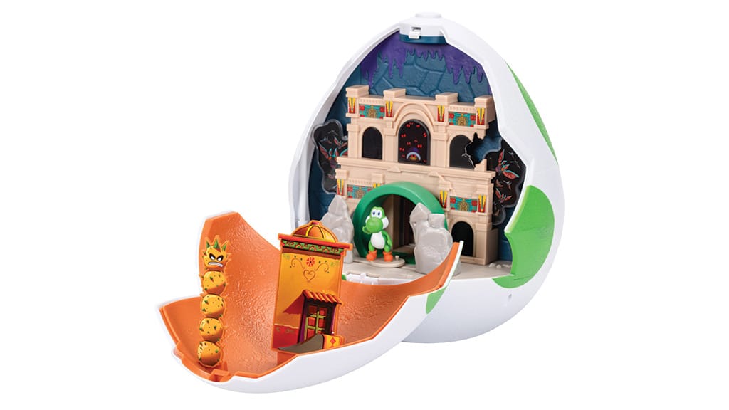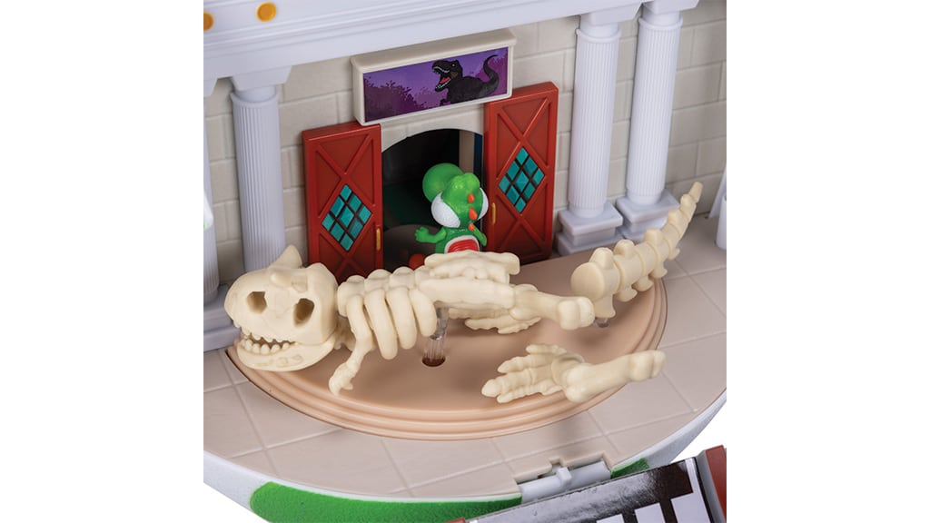 Razbij to zeleno Yoshi jajce in odkrij osupljiv, dvostranski igralni set! Na strani New York oživi zgodovinski muzej s celotnim, razpadajočim okostjem dinozavra, medtem ko stran Dry Outpost vsebuje čarobno cev, netopirje, ki se premikajo ob pritisku na gumb, in pojavnega Pokey-ja. Set vključuje tudi 3,8 cm veliko akcijsko figuro Yoshi in Fire Mario, tako da se lahko otroci takoj podajo v pustolovščine. Ta igralni set je popolna izbira za vse oboževalce Super Mario, saj ponuja razburljivo, interaktivno igralno izkušnjo, hkrati pa zaradi podrobne izdelave odlično izgleda tudi na polici zbirateljev.