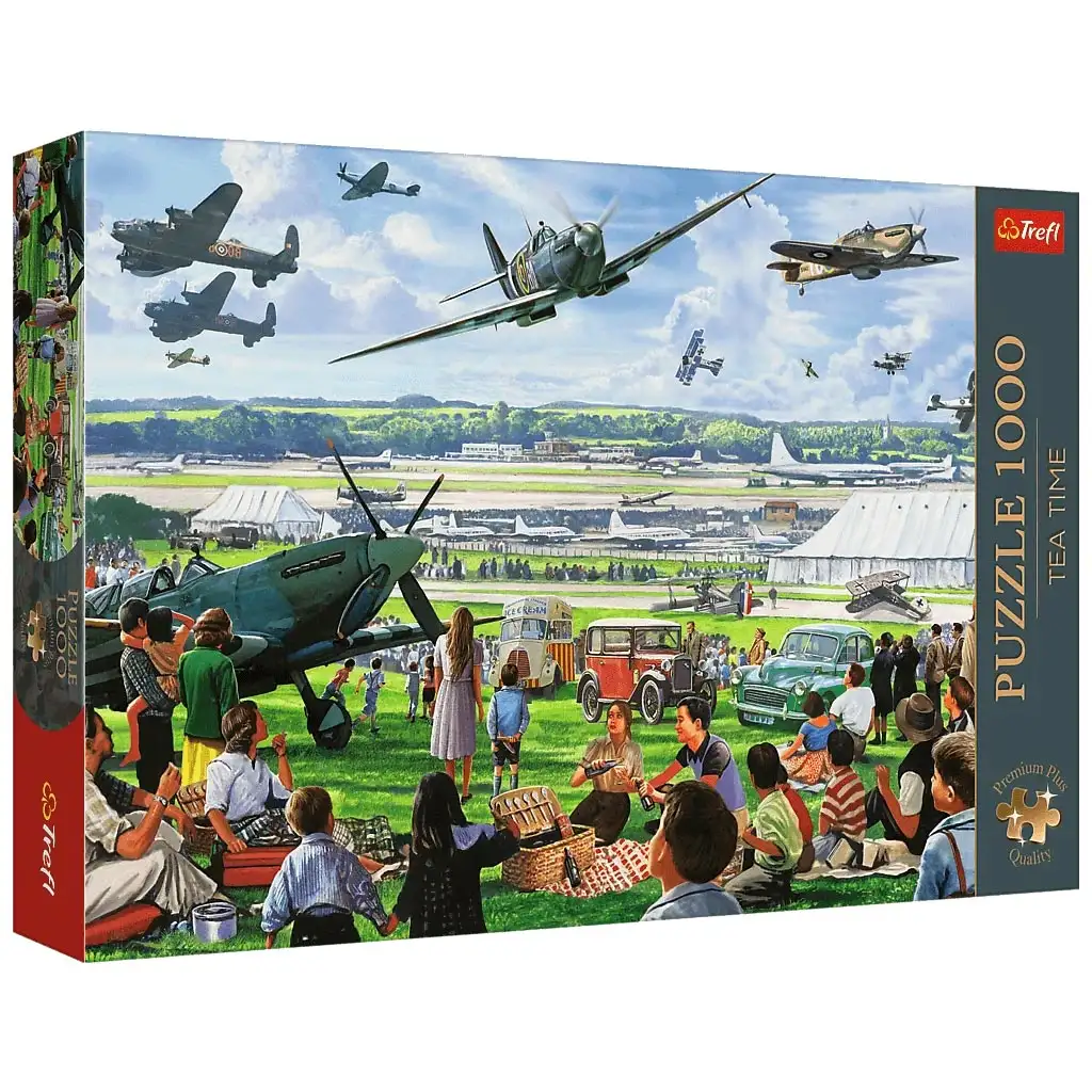 Poletite nazaj v čas v obdobje, ko je bilo letenje še pravi čudež! Puzzle z 1000 kosi z naslovom "Nebesna parada – Nostalgijski letalski dan" iz serije Tea Time ujame prizor iz preteklosti: družine na pikniku, starodobni avtomobili in osupljivi, klasični letala na letalski predstavitvi. V ozadju so vidni hangarji in vzletno-pristajalne steze, po nebu pa letijo legendarna vojna letala, ki režejo oblake. Prava časovna kapsula za ljubitelje letalstva – tako za otroke kot odrasle.