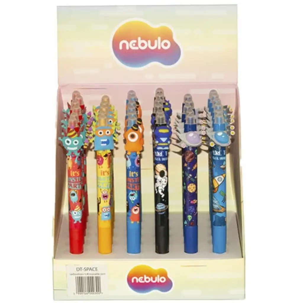 Nebulo gelni svinčnik s pritiskom in vesoljčki je odlična izbira za uporabo v šoli ali doma. Izbrisljiva tinta omogoča hitro popravljanje napak, zato zaradi zatipkane besede ni treba začeti z novim listom. Vesel, vesoljski dizajn ni le praktičen, ampak tudi zabaven, zato otroci še raje pišejo z njim. Zaradi ergonomske oblike je pisalo udobno za držanje, pritiskalni mehanizem pa zagotavlja enostavno uporabo. Na voljo je v naključno izbranih različicah s figuricami.