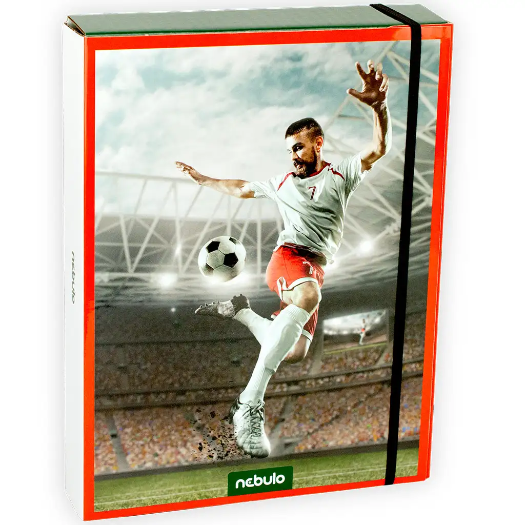 To je Nebulo škatla za zvezke velikosti A/5, ki je obvezna oprema za vsakega malega nogometnega navdušenca, ki si želi biti uspešen ne le na igrišču, ampak tudi pri učenju! Na naslovnici je prikazan dinamični nogometaš v akciji, ki pravkar leti proti žogi – prizor, ki takoj požene srce vsem športnim otrokom. V ozadju pa moderno stadionovo dogajanje vnese vznemirjenje tekme v šolsko vsakdanjost.