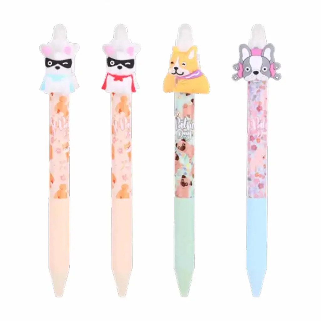 Pasje vrtljive kemične radirne gel pisalo ni le uporaben pisalni pripomoček, temveč tudi pravi vesele družabnik za ustvarjanje v šoli ali doma! Ta prikupna pisala so okrašena s srčkanimi figuricami kužkov, ki jih lahko vrtite na vrhu pisala, zato so zabavni spremljevalci pri pisanju in risanju. Tudi dolgočasnejšo uro popestrijo vrtljive kužkove glavice.