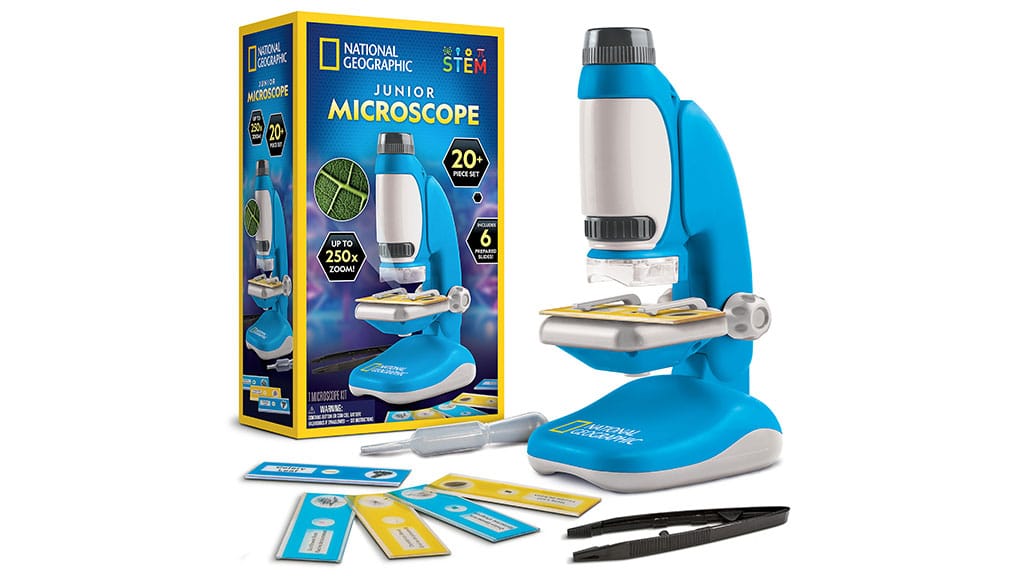 To je mikroskop s 250-kratno povečavo, z zgornjo in spodnjo osvetlitvijo ter odstranljivo okularjem. Otroci lahko sami zbirajo vzorce ali uporabijo šest vnaprej pripravljenih rastlinskih preparatov, da si od blizu ogledajo na primer borov cvetni prah, regratovo seme in še veliko drugih zanimivosti. Ta mikroskop je idealno orodje za odkrivanje narave in razvoj znanstvene radovednosti, medtem ko se otroci na igriv način učijo o čudesih mikroskopskega sveta.