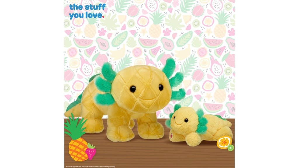 Odpotuj v trope s pomočjo Pineapple Axolotla! Ta posebna plišasta figura ti prinaša poletno vzdušje in tropsko veselje. Barvit in edinstven aksolotl, ki ga najdeš v ponudbi Build-A-Bear, je popolna izbira mindazoknak, akik szeretik az egzotikus élményeket és a különleges játékokat. Razveseli sebe ali svoje bližnje s tem veseljem, ananasovim aksolotlom in uživaj v tropskih dogodivščinah v udobju svojega doma!