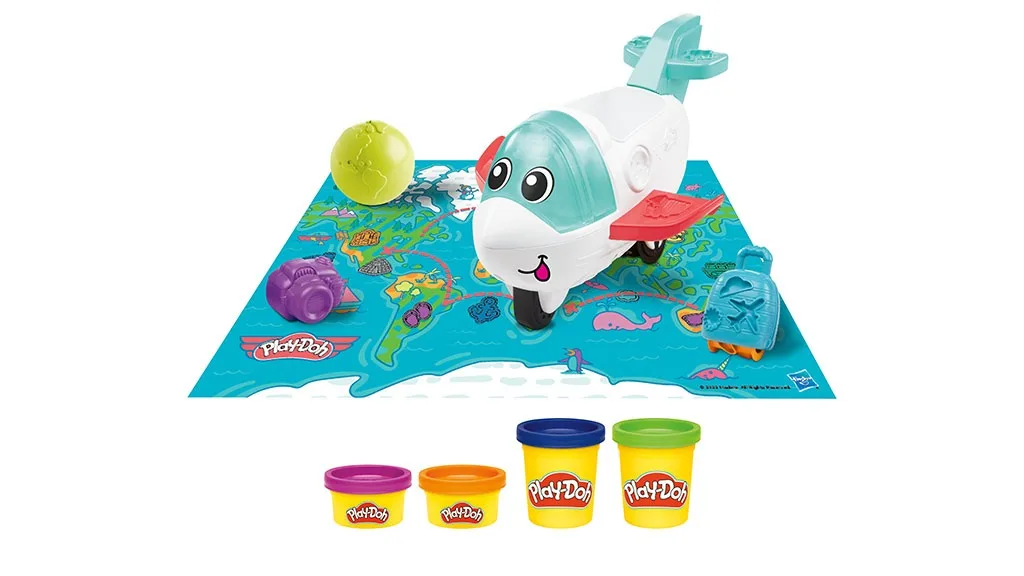 Otroci lahko raziskujejo svet iz kuhinjske mize s tem Play-Doh kompletom, ki vključuje letalo, igralno podlogo z zemljevidom sveta, tri Play-Doh orodja, ki oblikujejo različne predmete povezane s potovanji, in štiri barve Play-Doh.