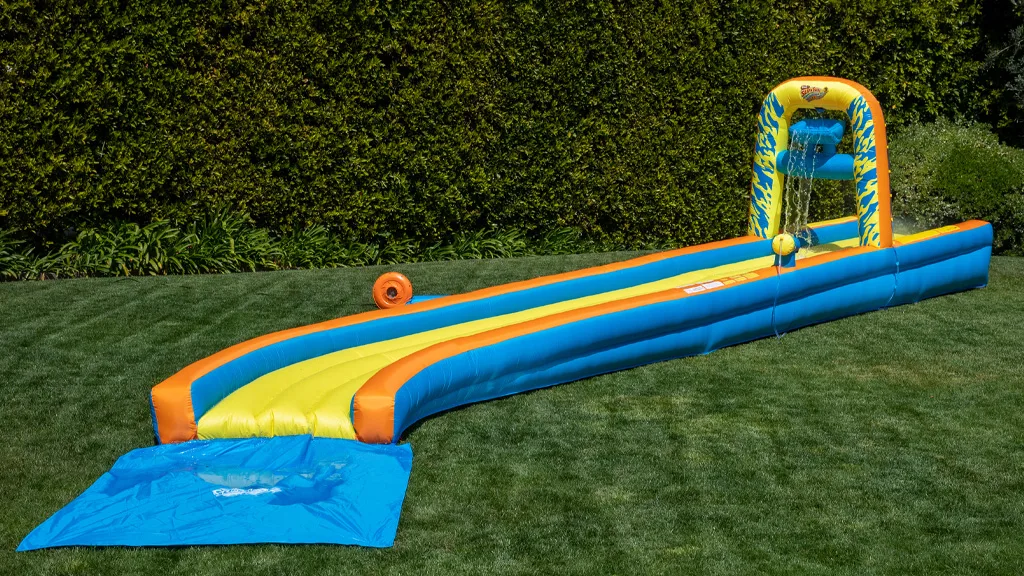 Novi Slip ‘N Slide Air ima 30 čevljev dolgo površino, napolnjeno z zrakom, ki jo lahko napihnete v eni minuti, če uporabljate priloženo tlačilko. Poleg tega ima avtomatski rezervoar za vodni slap in interaktivno vodno posteljo ter povišan zavoj na koncu.Svetlo rumena, oranžna in modra zunanja igra bo velik uspeh na poletnih rojstnodnevnih zabavah ali v vročih, lenobnih poletnih dneh.