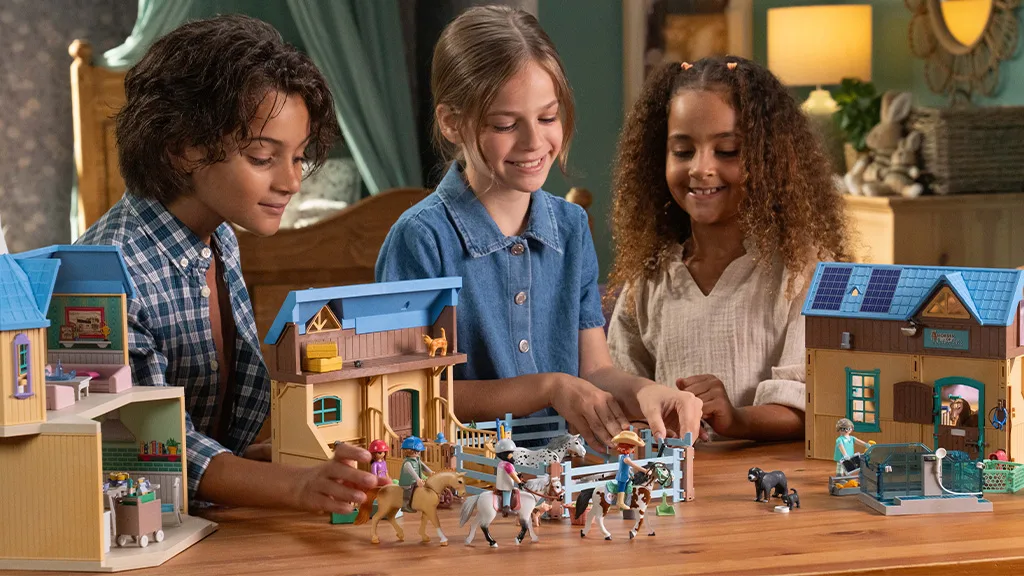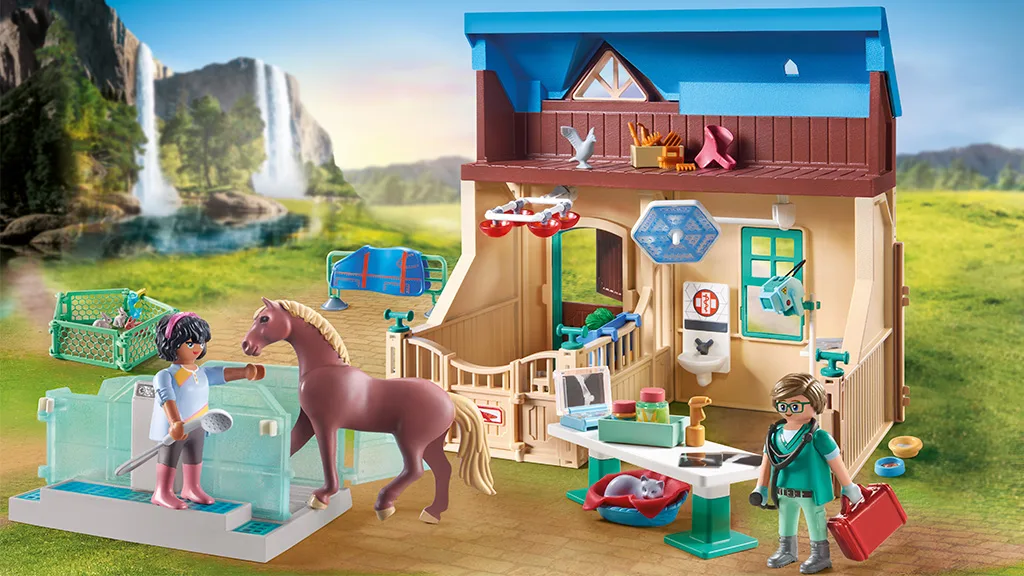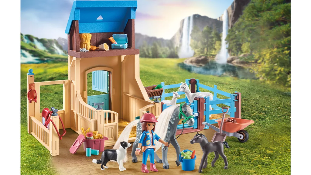 Skoči v sedlo in se pripravi na domišljijsko potovanje v čarobni svet Playmobil Vodopad Konjeniške Farme. Otroci se lahko pridružijo Isabelli, Zoé, Benu, Amelii, Ellie in njihovim žrebetom ter ponijem v neskončnih avanturah vlog. Od ogromnega, 264-delčnega kompleta Vodopad Konjeniške Farme do Terapije za konje in Veterinarske prakse, otroci lahko raziskujejo vse vznemirljivosti življenja na kmetiji.