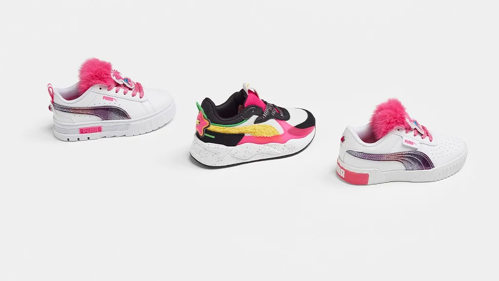 V kolekciji predstavljeni čevlji znamk PUMA Myze, Suede in RS-X izpostavljajo like Trollov, kot so Tiny Diamond in Queen Poppy, ki se pojavljajo na njih, na primer s slikami likov na vezalkah in z dlakavimi jeziki, da bi priklicali frizure Trollov.A zabava se ne konča pri čevljih. Ta kolekcija vključuje tudi grafične majice, trenirke, hlače za trening in puloverje z okroglim izrezom, ki so okrašeni z ikoničnimi temami Trolov.