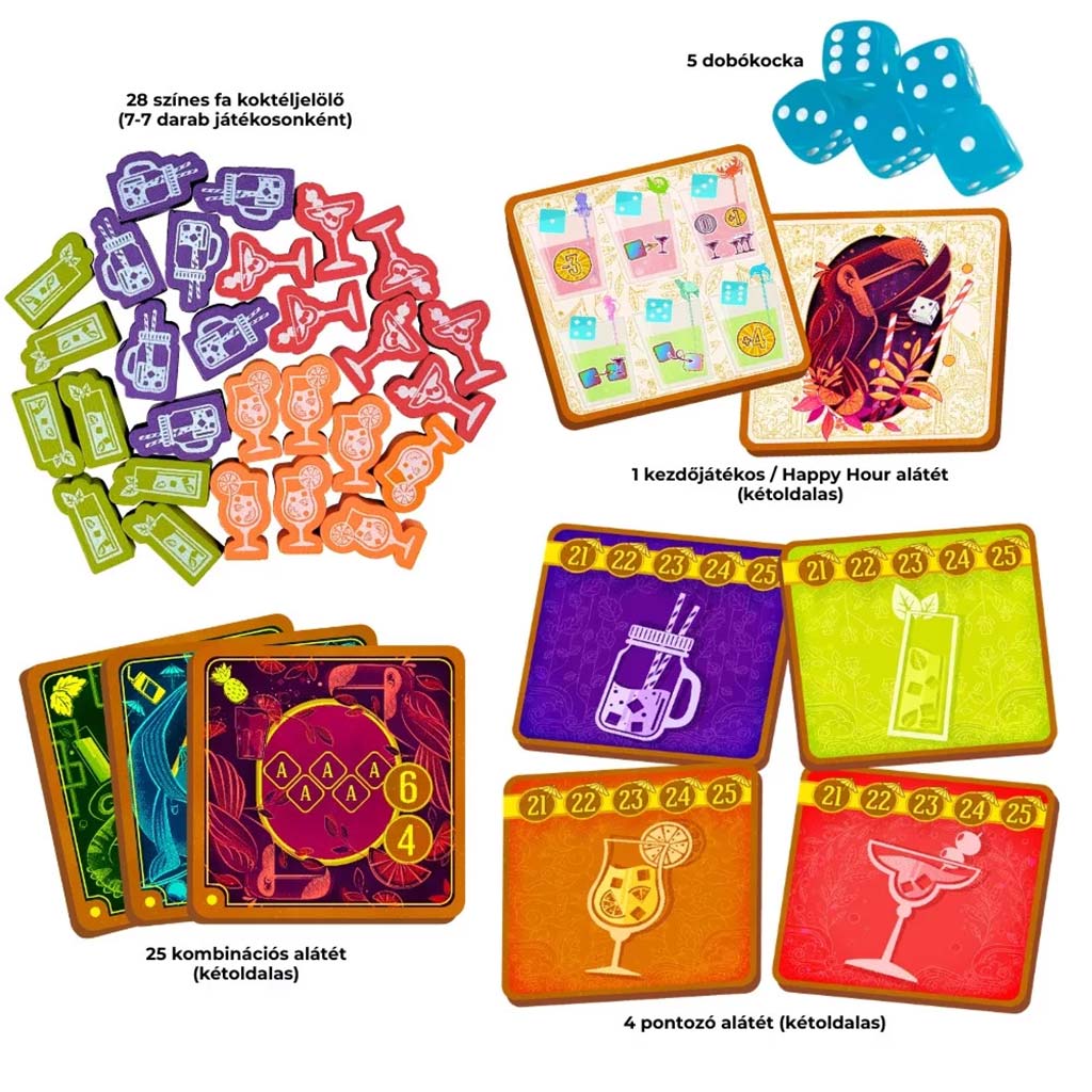 - Vsebina škatle: 5 šeststranskih kock, 28 lesenih koktajl-žetonov, 30 igralnih podstavkov, 1 priročnik s pravili