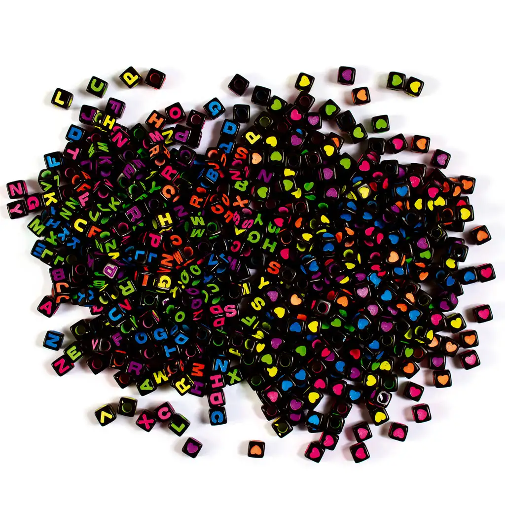 Te črne kroglice za nizanje z natisnjenimi črkami so pravi ustvarjalni zaklad za izdelovalce nakita in ustvarjalce. Paket vsebuje črne kroglice na kvadratni osnovi, ki tvorijo zanimiv kontrast z živahnimi neonskimi barvami ali vzorci srčkov. Približno 600 kroglic omogoča osebno ustvarjalno izražanje. Premer teh kroglic je približno 7 mm, kar zagotavlja idealno velikost za nizanje in oblikovanje.
