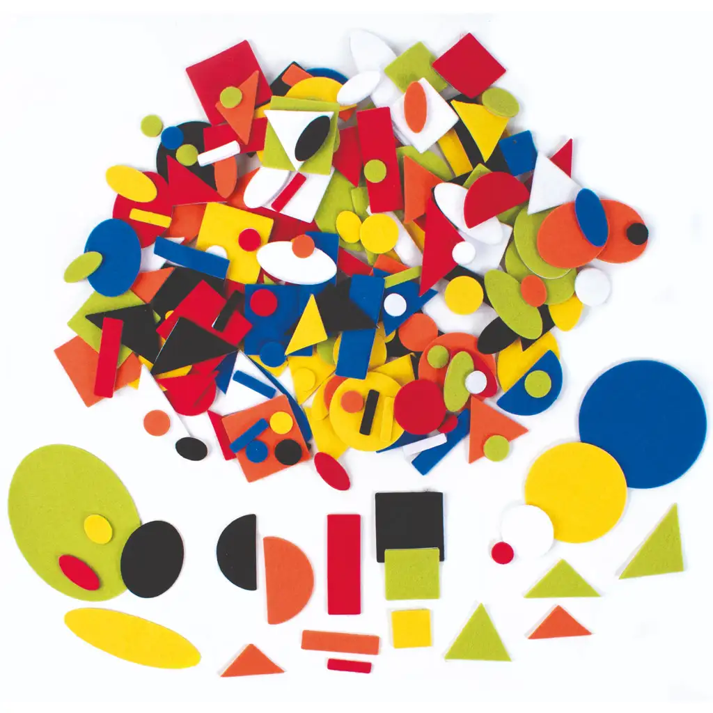 Geometrijske oblike iz filca ponujajo samolepilno rešitev za ustvarjalne projekte. Najpogostejše oblike, kot so krogi, kvadrati, pravokotniki in trikotniki, lahko enostavno prilepite na želeno površino.