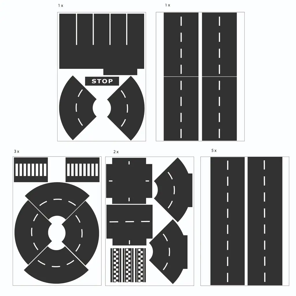 Nalepke za cesto so popolna izbira, če želite ustvariti še bolj raznoliko igralno pokrajino za igrače avtomobile. Te nalepke prikazujejo ovinke, križišča, krožišča in prehode za pešce, tako da lahko resnično oživite zamišljeno igralno območje.