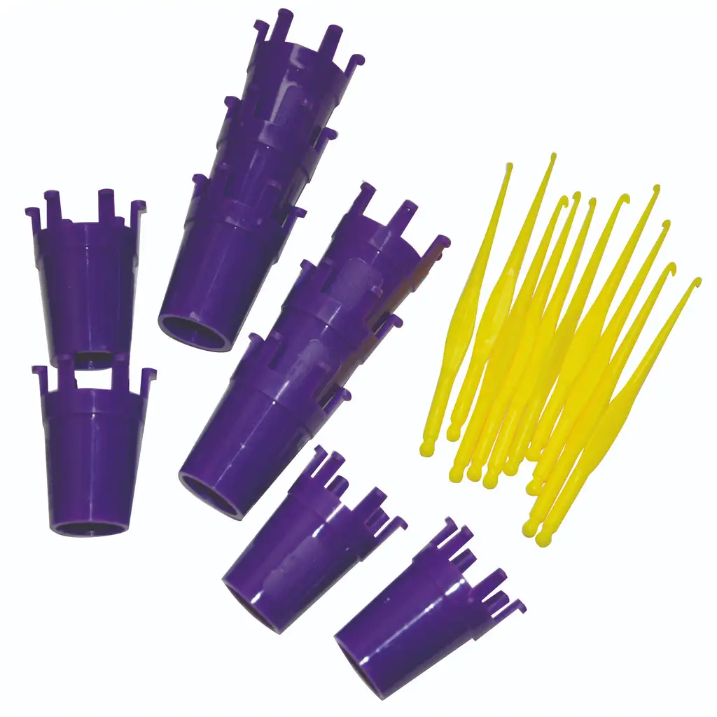 Velikost obročkov je 30 x 40 mm, velikost kvačk pa 85 x 4 mm. Vsi pripomočki so na voljo v vijolični in rumeni barvi, kar omogoča še več barv in raznolikosti pri tvojih kreacijah.