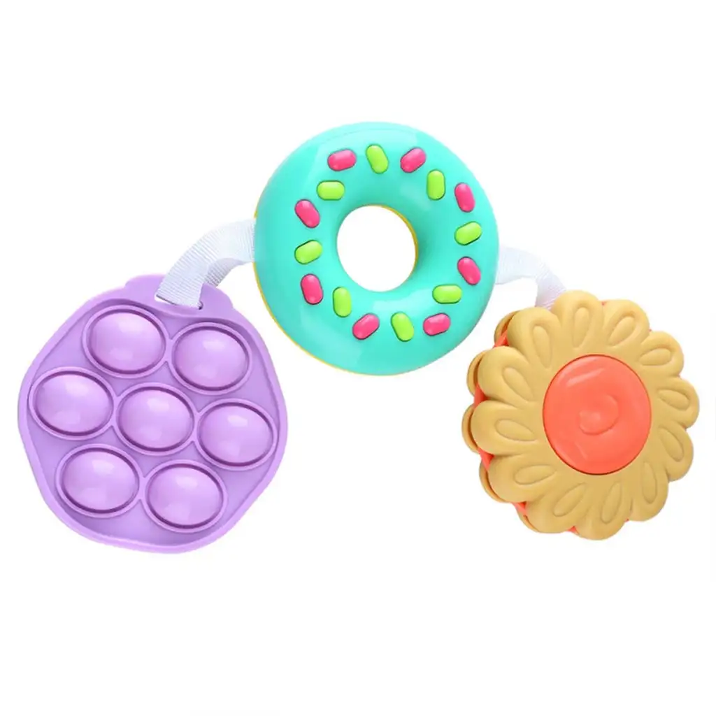 Prvi član Tria je vijolična "pop it" plošča z mehurčki, ki dojenčku nudi neskončno zabavo. Pritiskanje gumbov ni le zabavno, ampak tudi pomaga pri razvoju finih motoričnih sposobnosti. Drugi element je igrača v obliki krofa z glazuro, ki s svojimi veselimi barvami in podrobnim dizajnom pritegne pozornost otrok in spodbuja razvoj vida. Tretji element je ropotuljica v obliki nasmejane rože, ki s prijetnim zvokom razvija sluh in razumevanje vzročno-posledičnih povezav.