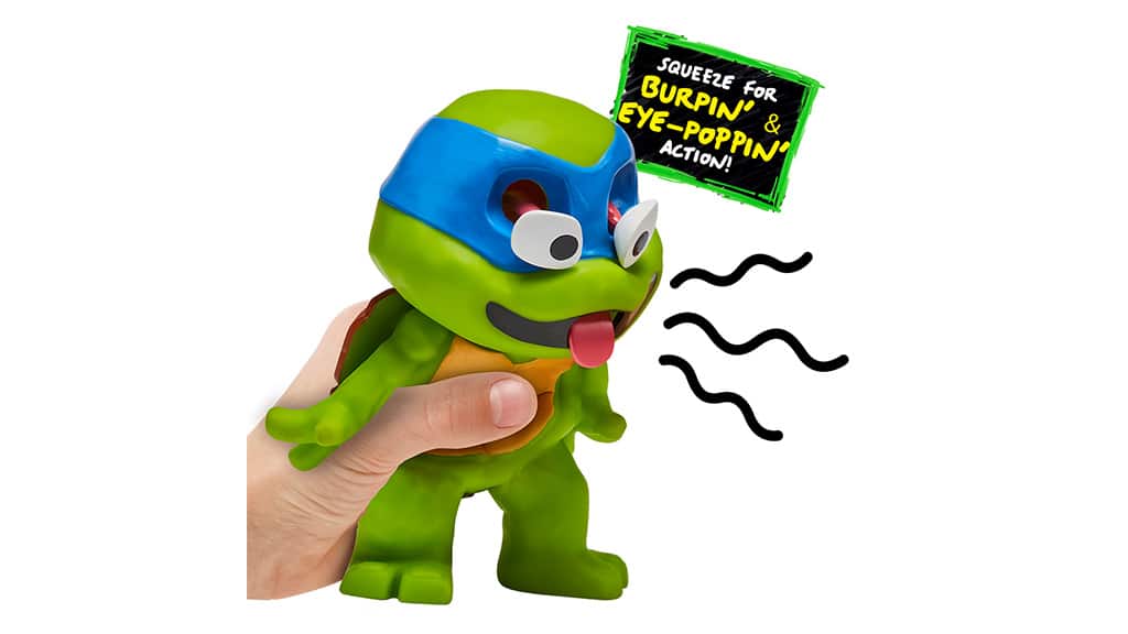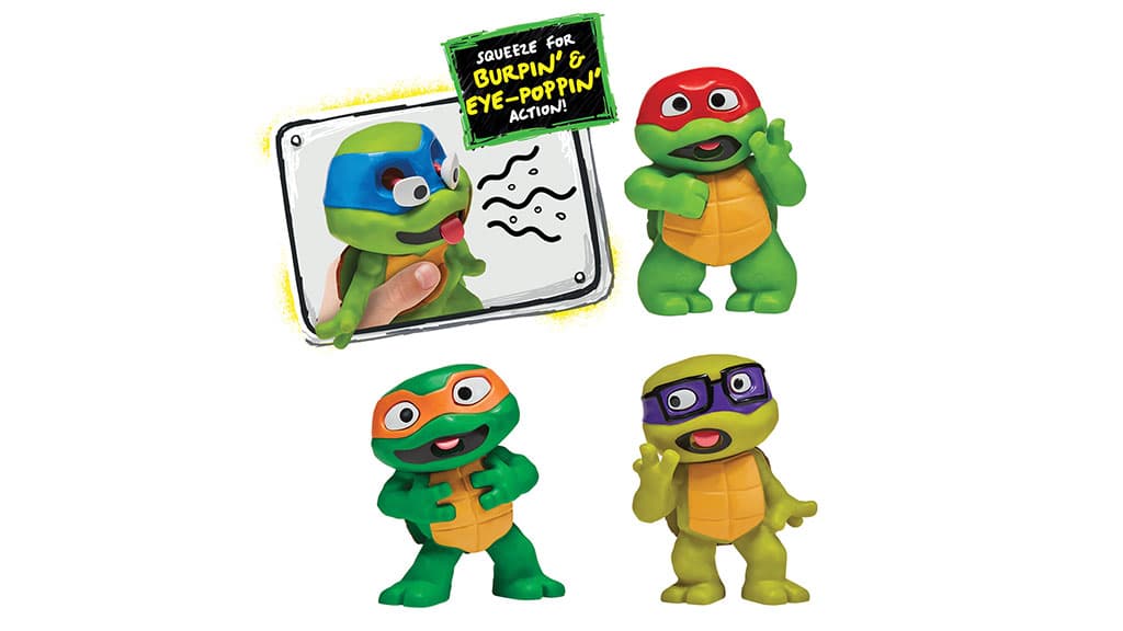 Playmates Toys najnovejše zbirateljske figure moč želv zdaj zamenjujejo z močjo riganja! Zgodbe o Ninja želvah: Rigajoči želvji mladiči so figure iz mehkega plastike, ki z izbuljenimi očmi in izskočenim jezikom zabavajo otroke. Ta zabavna, rigajoča ekipa – Leonardo, Raphael, Donatello in Michelangelo – oddaja zvoke, podobne prdcu, ko jih otroci močno stisnejo. Te figure niso le zabavne, ampak ponujajo tudi ustvarjalno igralno izkušnjo, medtem ko se otroci igrajo s svojimi najljubšimi junaki. Vsak član zbirke predstavlja edinstven, zabaven lik, zato lahko otroci z veseljem odkrivajo posebne zvoke in gibe, ki jih te figure zmorejo.