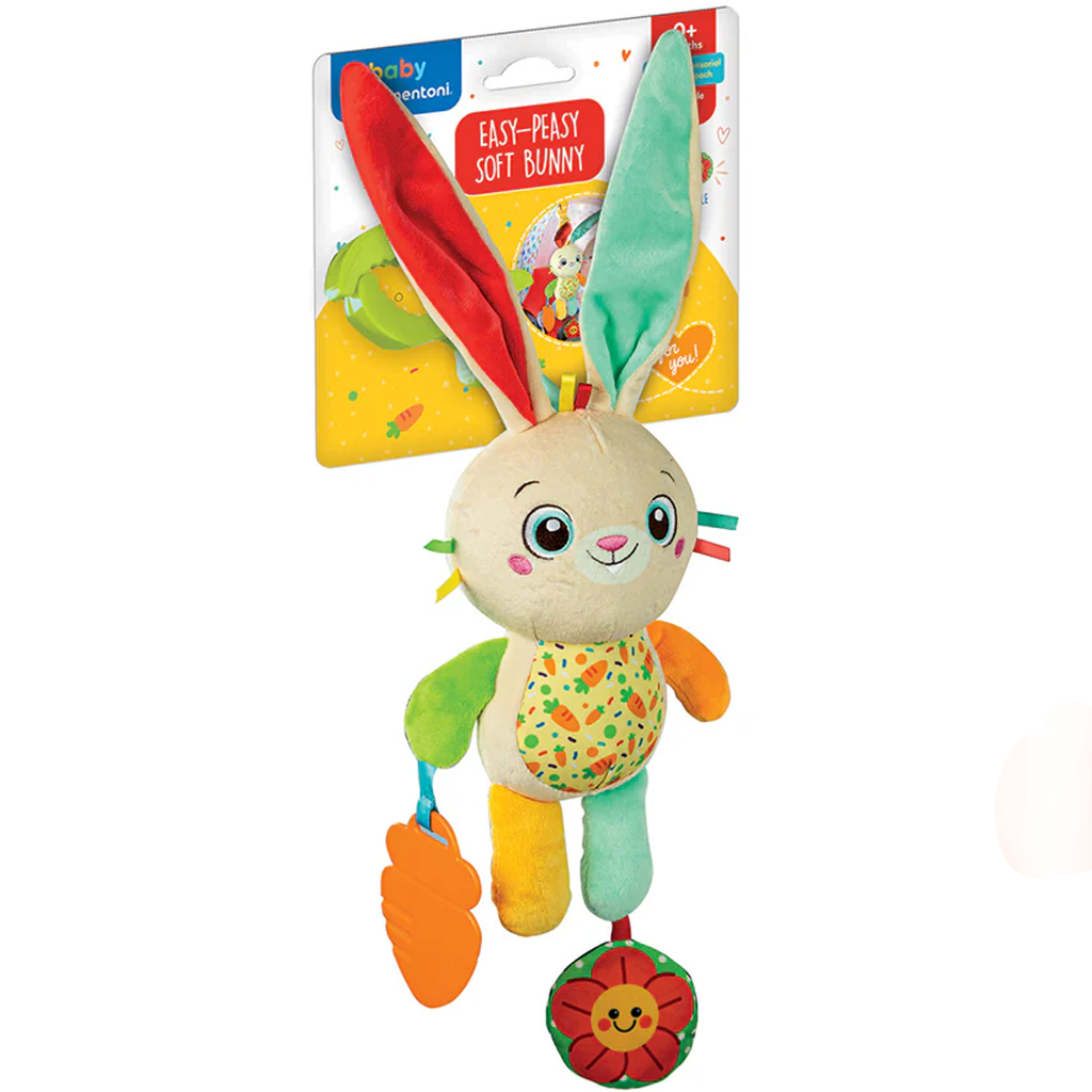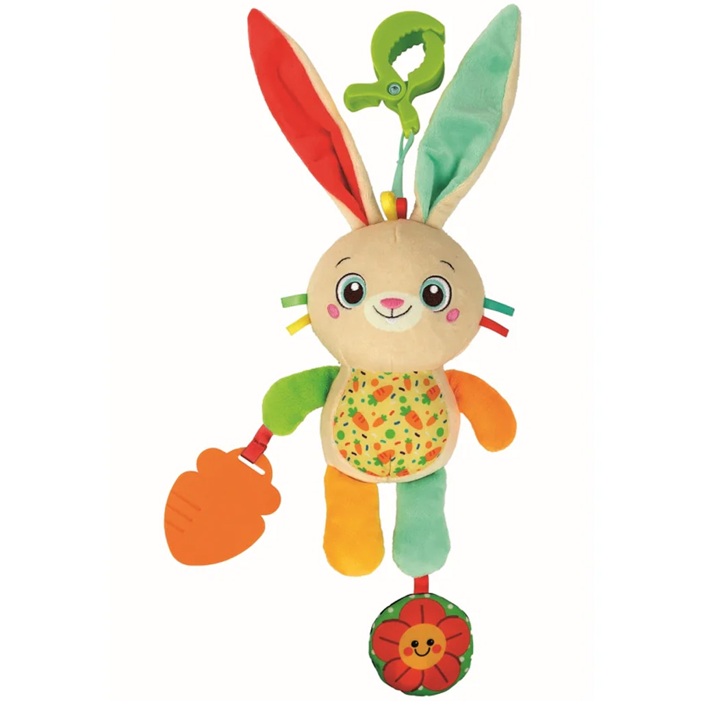 Plišasti zajček On the go je popoln sopotnik za najmlajše, ne glede na to, ali gre za sprehod, potovanje ali le kratko nakupovanje. Prikupen, barvit zajček na sliki je izdelan iz mehkih materialov, zato ga lahko dojenček varno objema in mu nudi pomirjujoč občutek. Dolgi uhlji, različne teksture in veseli viseči dodatki – kot sta korenček in cvet – med igro razvijajo zaznavanje in fino motoriko. S praktično sponko ga lahko enostavno pritrdite na voziček, avtosedež ali posteljico, zato bo vedno pri roki.