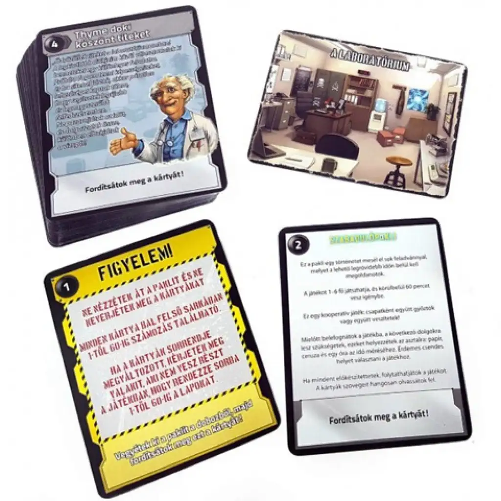 Pobeg iz laboratorija je odlična priložnost, da izkušnjo sobe pobega vzamete s seboj v žepu. Osnovna situacija igre je, da dr. Thyme prosi za vašo pomoč, vendar preden lahko razloži svoje načrte, izgine skozi loputo in vaša majhna ekipa ostane ujeta v njegovem laboratoriju. Ali se boste lahko pravočasno rešili? Iz zaklenjenega laboratorija se lahko igralci rešijo z odkrivanjem povezav na kartah Pobeg iz laboratorija, kombiniranjem predmetov na njih z drugimi kartami. Pri reševanju ugank pomaga tudi to, da se počasi razkrivajo neizrečeni načrti doktorja. Rešujte uganke, pridite do konca zgodbe, uporabite najdene predmete in če boste dovolj spretni, uspeh ne bo izostal.