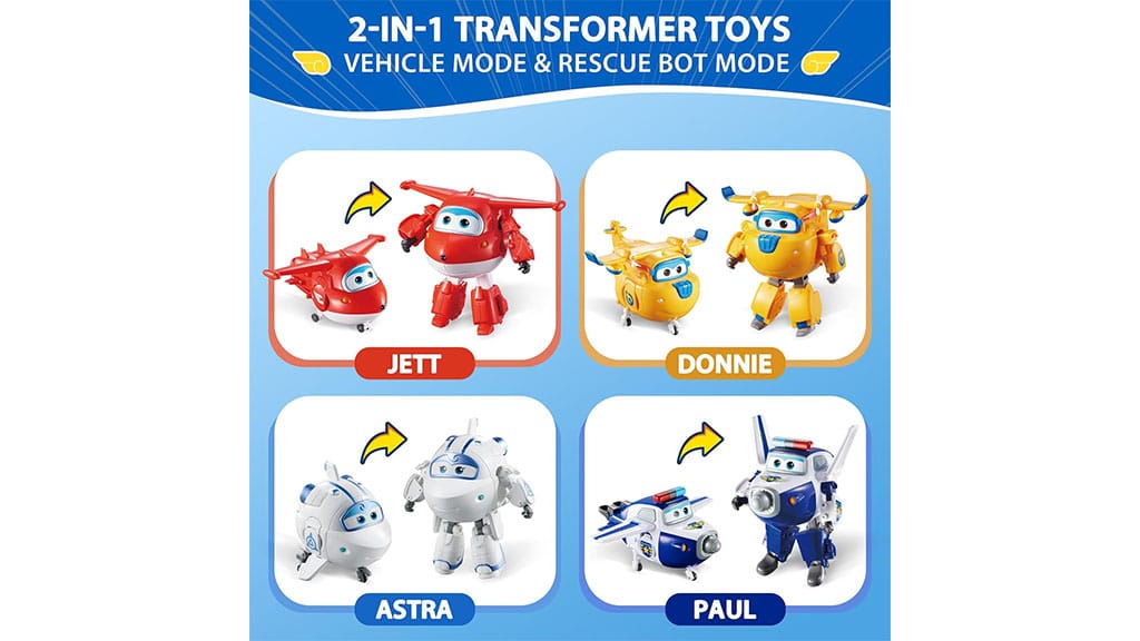 Ta štiridelni komplet Super Wings vsebuje Jetta, Paula, Astro in Donnieja. Petpalčne figure je enostavno preoblikovati iz robotskega načina v način letala in nazaj. Te podrobno kidelane, vzdržljive igrače so popolne za ustvarjalno igro, pomagajo otrokom ponovno átélni svoje najljubše prizore iz serije, hkrati pa razvijajo njihove finomotorične spretnosti in domišljijo.