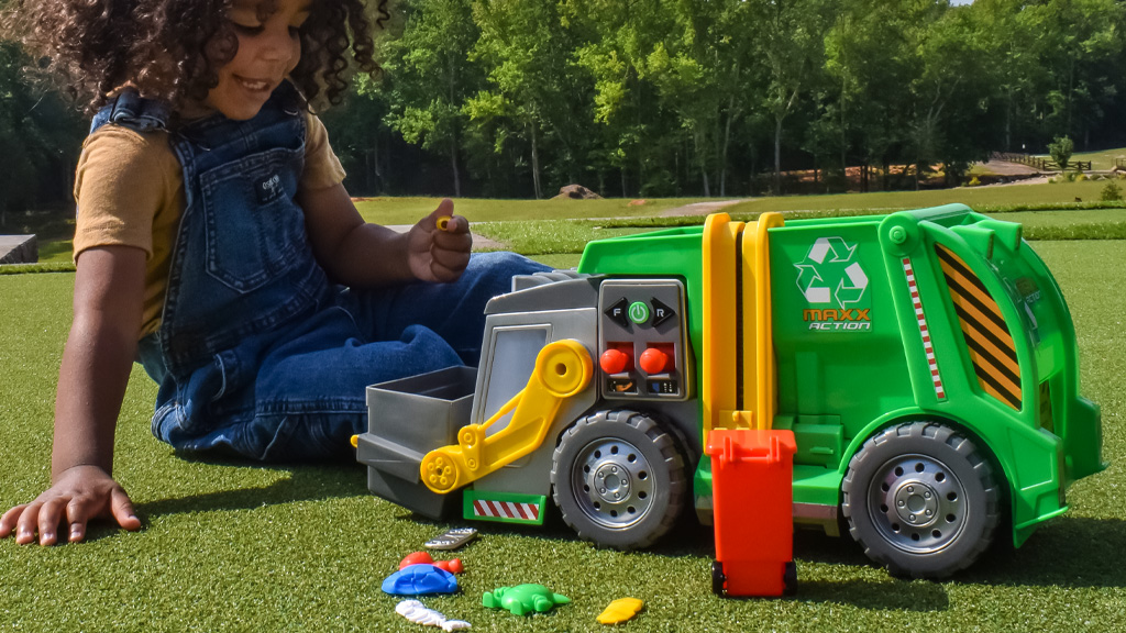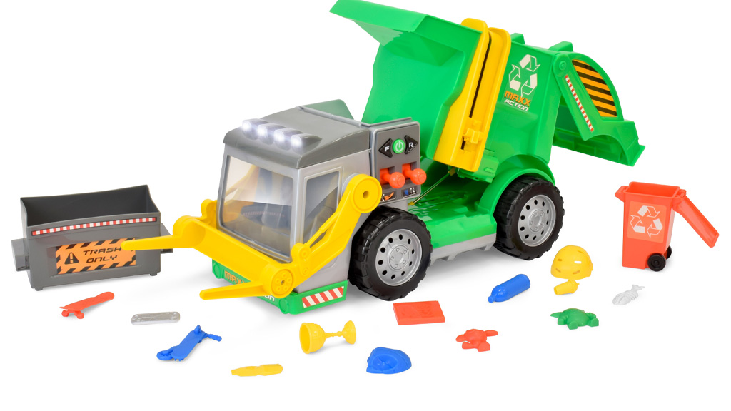 Otroci lahko z dvojnimi joystick krmilniki zbirajo priloženih 15 kosov smeti — sprednji nakladalec jih dvigne in vrže na tovornjakovo ploščad, odstranljiva smetarska posoda se premika gor in dol, zadnja vrata pa se odprejo, da izpraznijo smeti. Otroci lahko tovornjak premikajo naprej in nazaj.Ta igra ni le zabavna, ampak tudi razvija otrokove "fino motorične spretnosti" in "koordinacijo". S pomočjo "kreativne igre" se otroci naučijo pomena "varstva okolja", medtem ko se zabavajo. Tovornjak je izdelan iz "trpežnih materialov", zato bodo lahko dolgo uživali v igri.