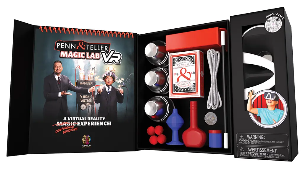 Več kot 40 let sta Penn & Teller kot mojstra iluzije ujela občinstvo. Toda za iluzijo in čarovnijo se skriva talent, ki ga večina ljudi nikoli ne upošteva, in to se lahko pripisuje veščinam, ki se jih lahko naučijo in osvojijo tudi otroci.Penn & Tellers Magic Lab VR je najnovejša inovacija podjetja Abacus Brands, ki je pionir na področju kompletov za virtualno in obogateno resničnost (VR & AR), ki izobraževanje naredijo zabavno in privlačno. S tem 75-delni čarovniškim kompletom se lahko otroci naučijo 28 različnih trikov, medtem ko odkrivajo svoje skrite talente in gradijo svojo samozavest, samozadostnost ter veščine javnega nastopanja.