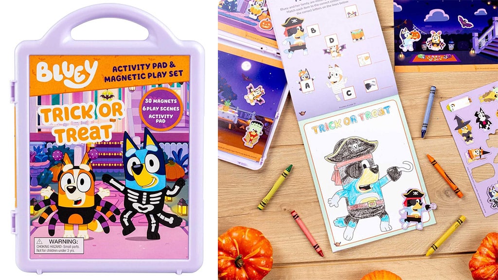 Ta komplet vsebuje 30 magnetnih elementov, s katerimi se lahko igrate. Ti kosi predstavljajo različne oblike in barve, zato razvijajo otrokovo ustvarjalnost in fine motorične spretnosti. Magnetne elemente je enostavno namestiti in odstraniti, zato je igra hkrati zabavna in poučna. Idealna izbira za zabavo doma ali celo med potovanjem.Tudi malčki lahko doživijo vzdušje noči čarovnic s knjigo z okenci "Bluey in Bingo knjiga strašljivih stvari", v kateri brat in sestra odkrivata vznemirljiva, a nem preveč strašljiva presenečenja okoli hiše – na primer plazeče žuželke v bazenu ali skrivnostne plesne kroge. Ta knjiga na igriv način segá otrokom pri spoznavanju in feldelavi strahov, medtem ko se lahko skupaj smejijo z družino. Za večje otroke so na voljo tudi pobarvanka in magnetna delovna zvezek, ki ponujata ducate interaktivnih ugank, labirintov in prazničnih iger, tako da vsakdo najde najzanimivejšo dejavnost v tem vznemirljivem letnem času.