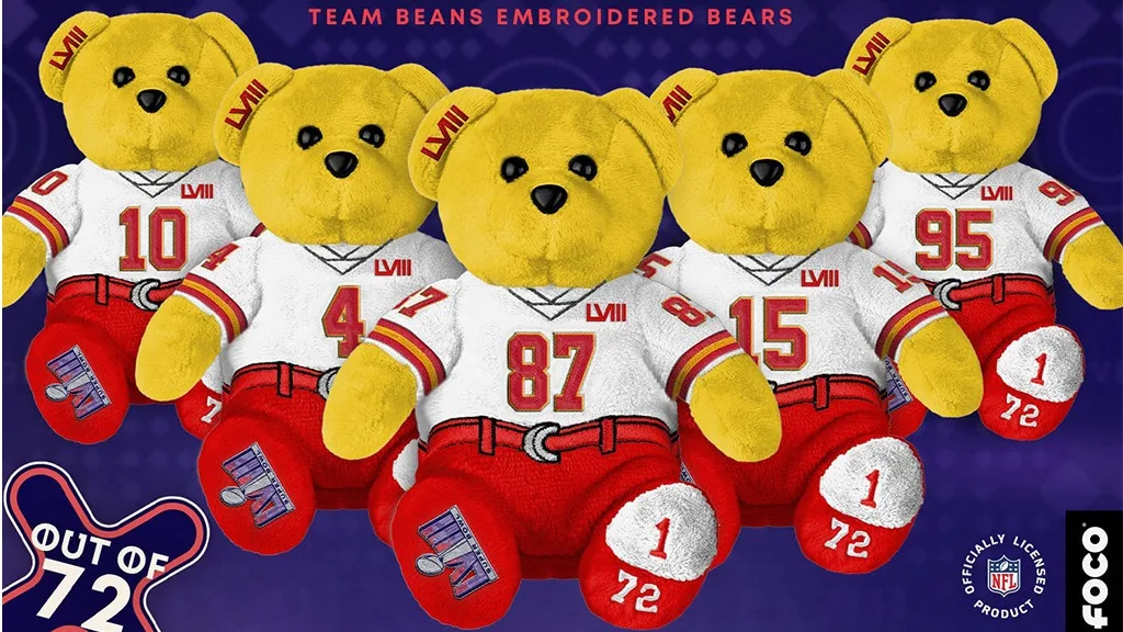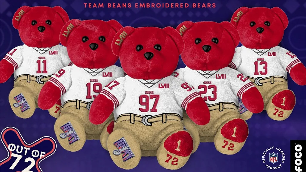 Navijači Kansas City Chiefs naj se navdihujejo z medvedki, ki jih navdihujejo Patrick Mahomes, Travis Kelce, Rashee Rice, Chris Jones in Isiah Pacheco. Navijači San Francisco 49ers lahko izbirajo med Nickom Boso, Christianom McCaffreyjem, Deebo Samuelom, Brockom Purdyjem in Brandonom Aiyukom.