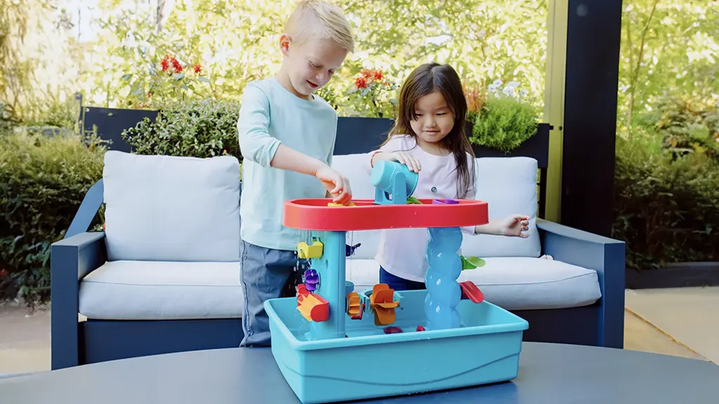 zunaj, kar omogoča neskončne možnosti za vodne pustolovščine, kjerkoli se otroci želijo igrati.Ta vodna igra je popolna za katero koli priložnost za igro! Zabavna in izobraževalna, zagotavlja dinamično in interaktivno izkušnjo z vodnimi igrami. Vsi deli se prilegajo v shranjevalnik, kar zagotavlja urejen prostor za igro in enostavno prenašanje. Igra je tudi odlična za senzorično igro in razvoj finomotoričnih spretnosti otrok. Starši jo lahko enostavno sestavijo brez vsakršnega truda.
