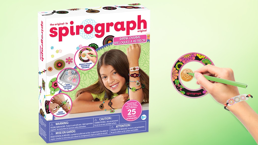 Ta komplet združuje zabavo Spirographa z možnostjo izdelave unikatnega nakita. Uporabite vnaprej pripravljene vzorce ali ustvarite unikatne umetnine na priloženih plastičnih ploščah, ki se hitro skrčijo v pečici. Z njim lahko izdelate "25 kosov nakita".