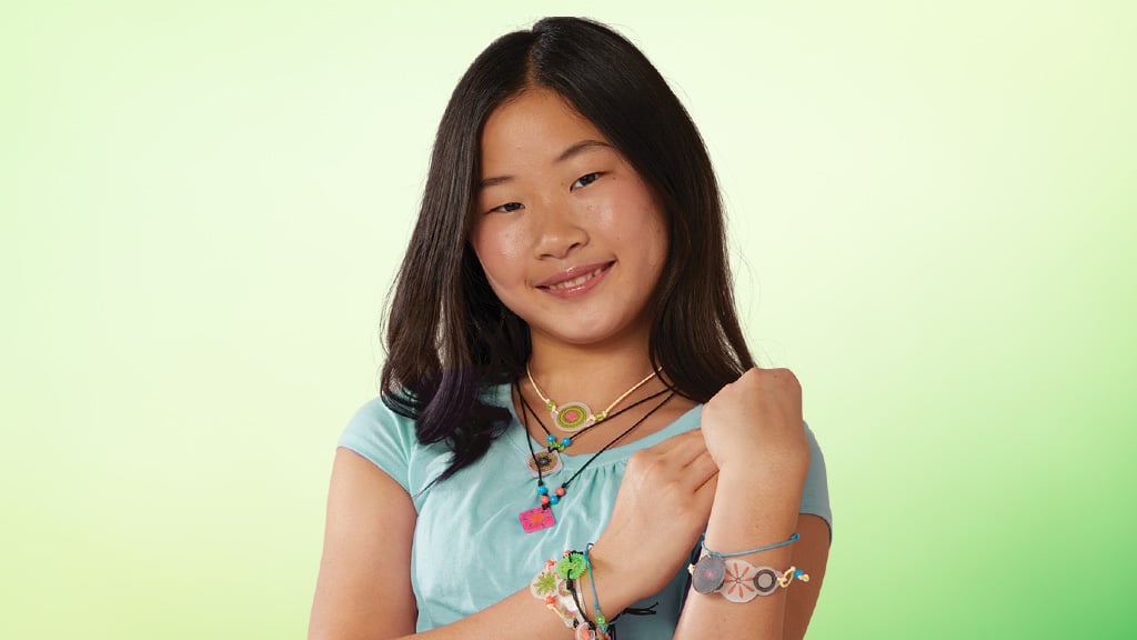 nakitov. Otroci lahko uporabljajo vnaprej pripravljene vzorce ali ustvarjajo lastno umetnost na priloženih plastičnih listih, ki se hitro skrčijo v pečici. Družine lahko sledijo vzorcem ali uporabijo svojo domišljijo za izdelavo zapestnic, ogrlic in še veliko več s pomočjo priloženih vrvic, kroglic in sponk.