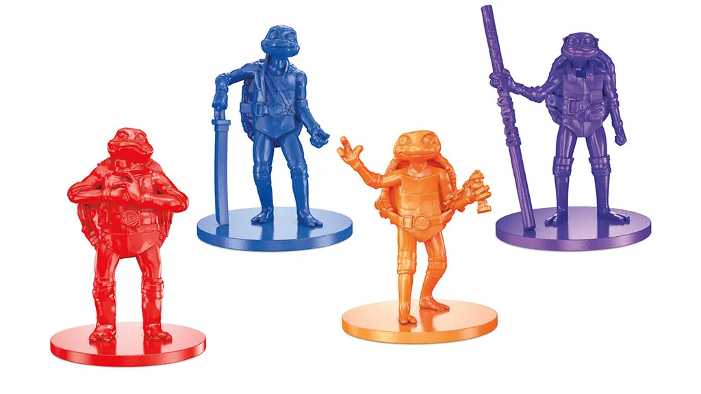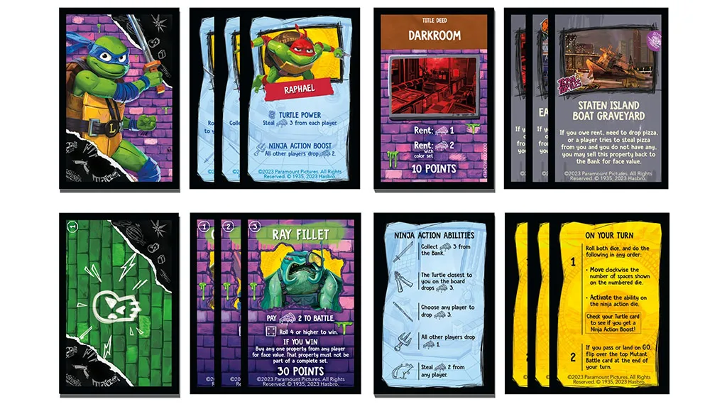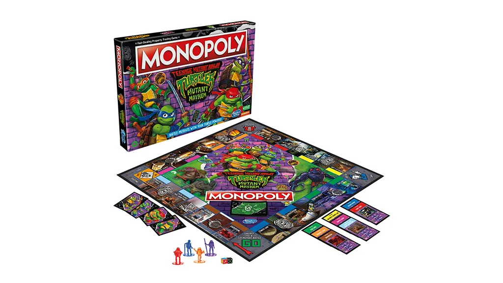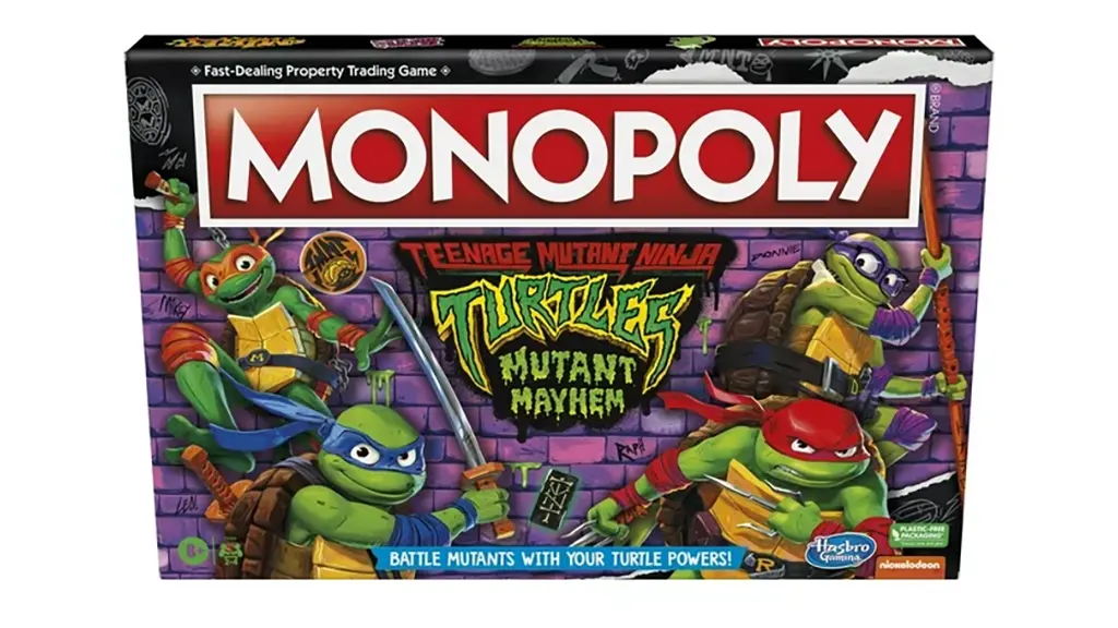 Hasbro Monopoly igra je padla v kanalizacijo in se preobrazila v epsko novo igro! Ta različica Monopolyja je zasnovana okoli ikoničnega animiranega filma Teenage Mutant Ninja Turtles: Mutant Mayhem, ki je izšel lansko jesen. Namesto tradicionalnega Monopoly denarja, igralci kupujejo nepremičnine, kot so Kanalizacijski Glavni Štab, Pokopališče Ladij na Staten Islandu in Bowling Steza, z uporabo kosov in rezin pizze. Kot Leonardo, Raphael, Michelangelo ali Donatello, morajo otroci vsakič, ko prečkajo GO ali stopijo nanj, da bi zaslužili bonus točke, se boriti z nevarnimi mutanti. Ko otroci vržejo ninja akcijsko kocko skupaj z oštevilčeno kocko, lahko aktivirajo posebno ninja sposobnost, ki jim daje edinstveno prednost. Igra se konča, ko se zadnja bitka z mutanti zaključi, in igralec z največ točkami zmaga!