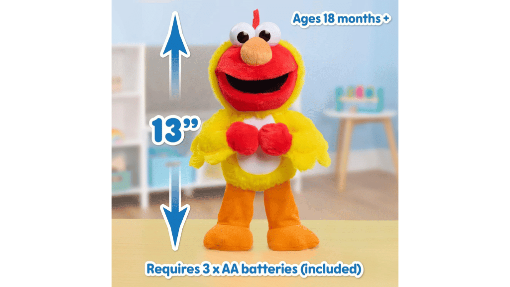 Interaktivna plišasta igrača Elmo iz Sezamove ulice, ki pleše piščančji ples, od Just Play je vznemirljiva interaktivna igrača, ki prinaša gibanje in veselje v življenje oboževalcev Elma. Otroci lahko pritisnejo na Elmove noge, da aktivirajo enega od dveh načinov igre: plesni način ali način šal. V plesnem načinu Elmo pleše in poje pesem piščančjega plesa; v načinu šal pa pripoveduje šale in spodbuja otroke, da se igrajo z njim.