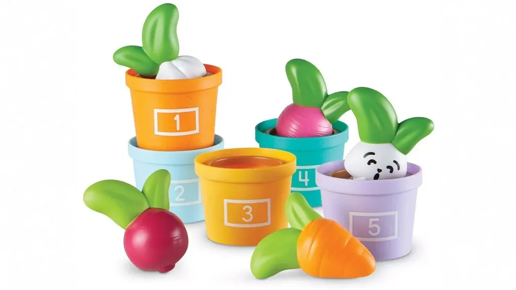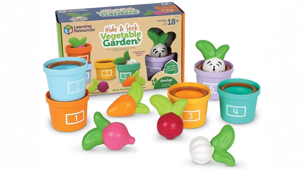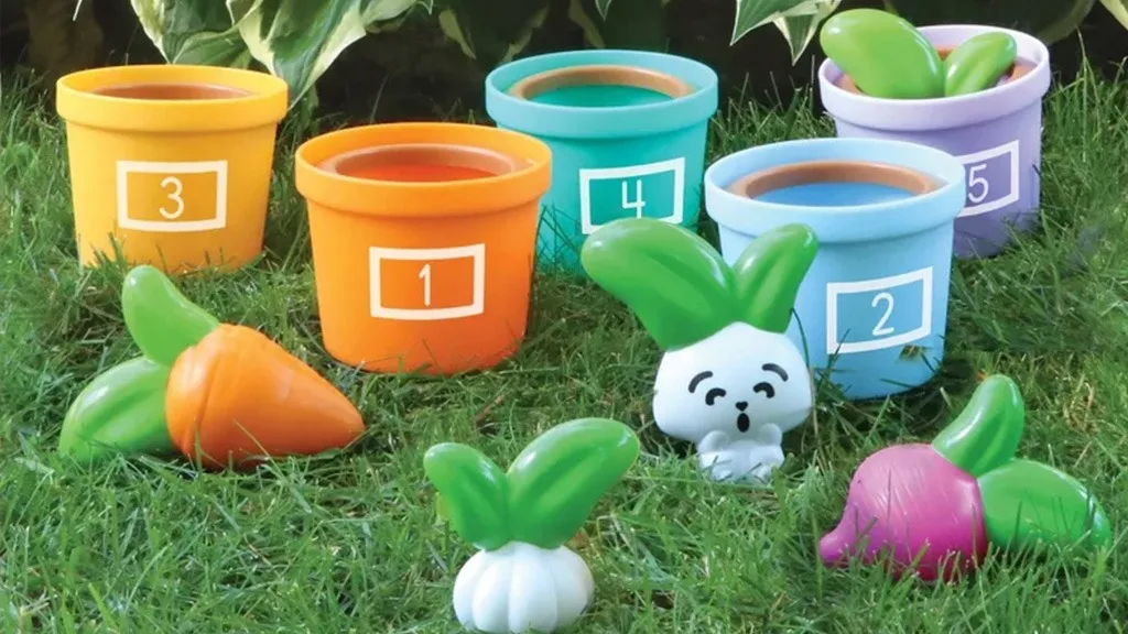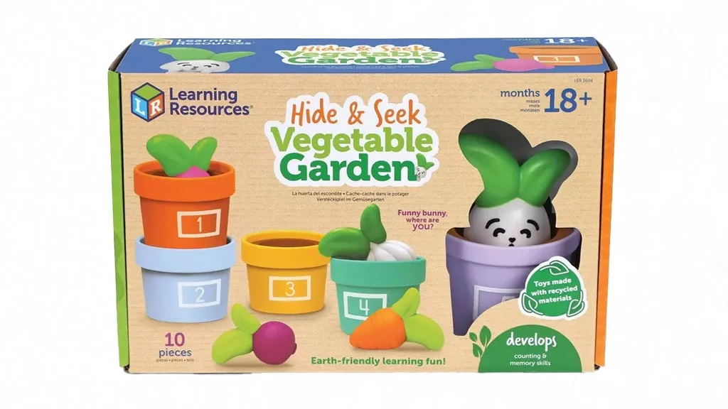 Vrt Uganke in Zelenjave je igralni komplet sestavljen iz 10 delov, ki spodbuja otroke k vadbi štetja, zlaganja in razvrščanja. Vključuje pet pastelnih, oštevilčenih lončkov in gumijaste zelenjave, med drugim strok česna, oranžno korenje, peso in redkvico. Otroci lahko v petem lončku najdejo tudi prijatelja: Zabavnega Zajčka!