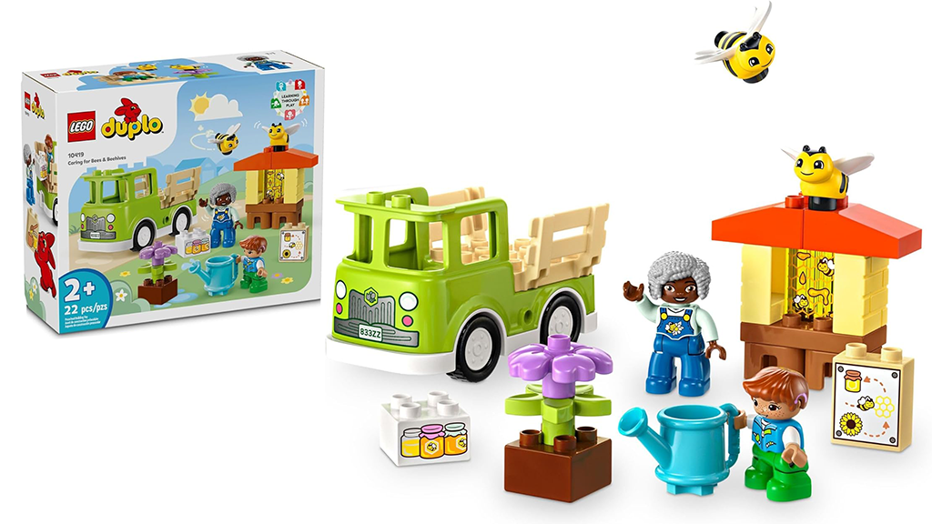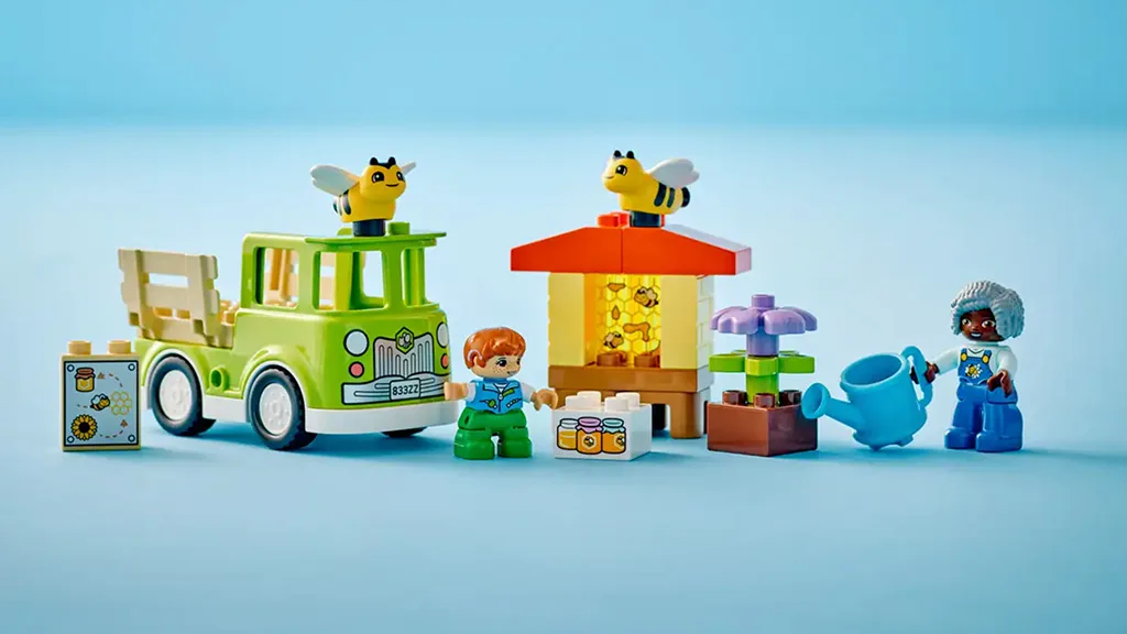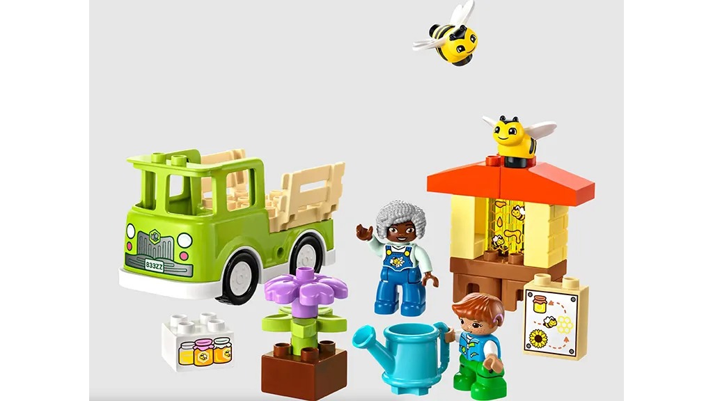 Ta komplet LEGO DUPLO prikazuje otroka in odraslega, ki delata v čebelnjaku. Kompleti DUPLO so sestavljeni iz večjih (in manjših) kosov, tako da se lahko majhni otroci učijo graditi na ravni, ki je primerna zanje. Komplet vsebuje 22 delov, vključno z odraslo osebo, otrokom, dvema čebelama in kmetijo.