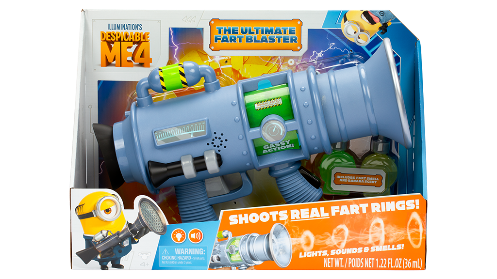 Pravočasno za premiero filma Gru 4, ta 14-palčni blaster je napolnjen z dvema steklenicama formule za prdenje, od katerih lahko vsaka ustvari do 5000 obročev na razdalji do 6 čevljev. Obroči dišijo po banani ali prdcu. Poleg tega ima luči in 15 različnih zvočnih učinkov prdenja, da zagotovi smeh otrok.