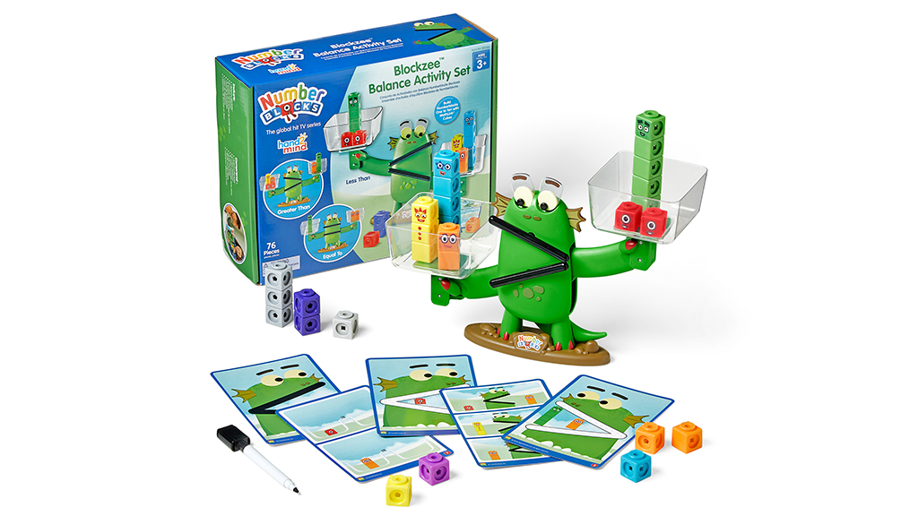 Komplet Blockzee Balance Activity Set vsebuje tehtnico z motivom pošasti, ki otrokom pomaga spoznavati številke in vrednosti. Komplet vključuje Blockzee tehtnico, dve prozorni vedri, 10 dvostranskih aktivnostnih kartic, 61 MathLink kock (v 12 različnih barvah za gradnjo številčnih kock), nalepko z obraznimi izrazi in suho brisljiv flomaster.Dejavnostne kartice so razdeljene na dve ravni: rdeče kartice vsebujejo številke do pet, medtem ko oranžne kartice pokrivajo številke do deset. Otroci lahko postavijo čiste vedra na roke Blockzeeja, nato pa glede na vizualna navodila na karticah napolnijo vedra z barvnimi številčnimi kockami, da se naučijo številk in matematike. Oči, usta in roke pošasti se bodo premikale za primerjavo številk; usta se odprejo proti vedru, ki vsebuje večje številčne bloke, da predstavijo simbol "večje kot" in prikažejo tudi simbole "manjše kot" in "enako".Medtem ko se igrajo z igračami, otroci učijo in razvijajo matematične spretnosti, vključno s štetjem, primerjanjem števil, seštevanjem in prepoznavanjem števil na zabaven in razburljiv način. V zvezku je na voljo več dejavnosti na obeh ravneh, tako da lahko starši in otroci takoj začnejo z učenjem.Ker otroci morajo fizično postaviti bloke in vidijo, kako se pošast premika v skladu z njihovimi pravili, bodo verjetno lažje zapomnili matematično lekcijo. Z premikanjem in preurejanjem blokov, kot to zahteva nastavitev, lahko skrbniki izognejo nemiru, ki se lahko pojavi med sedenjem na matematični uri, medtem ko otroci izpopolnjujejo svoje fine motorične sposobnosti.