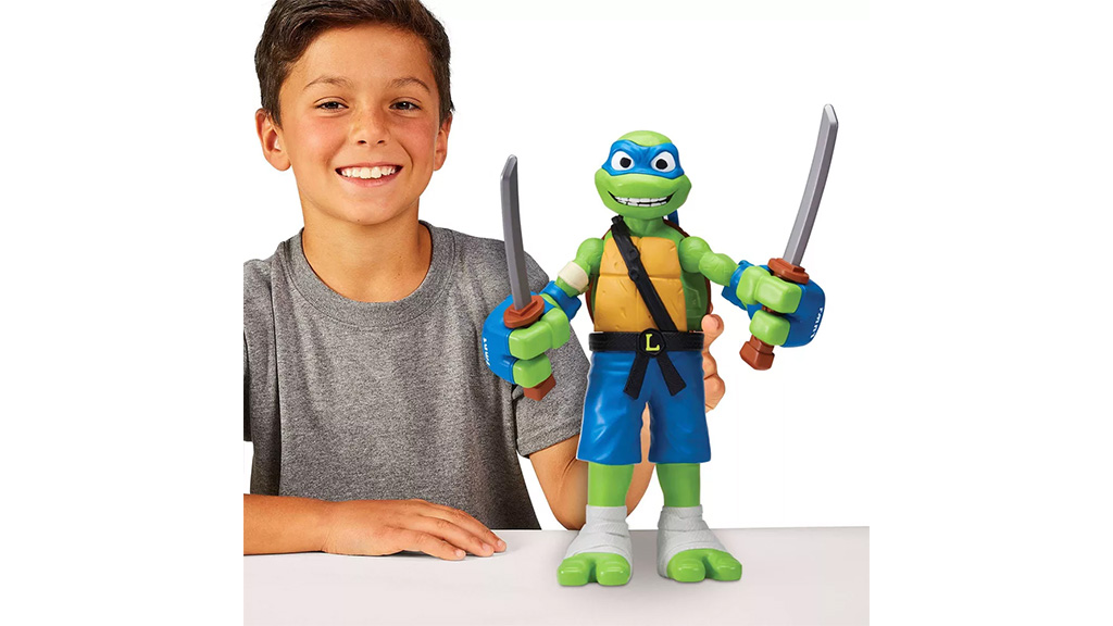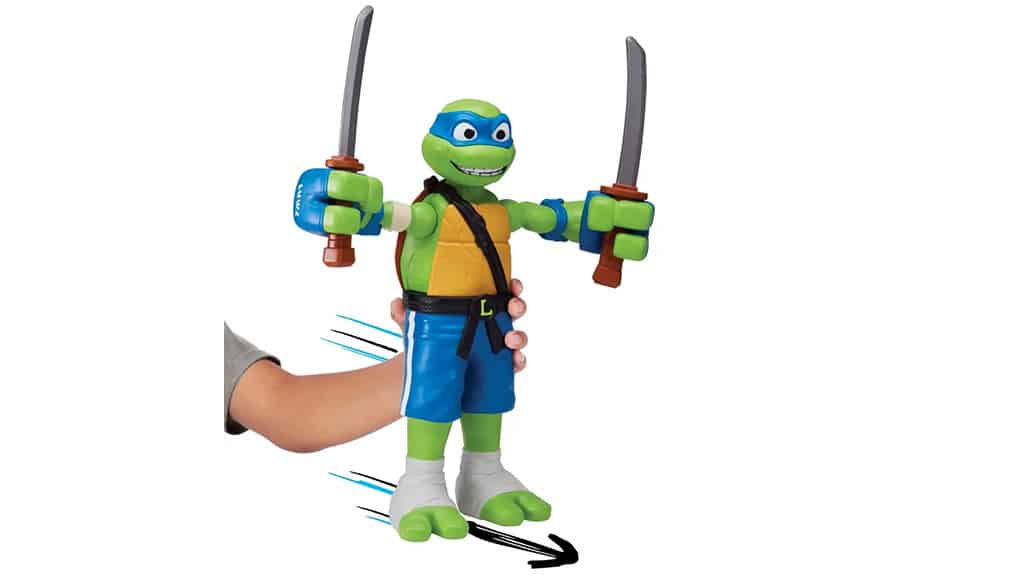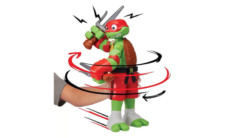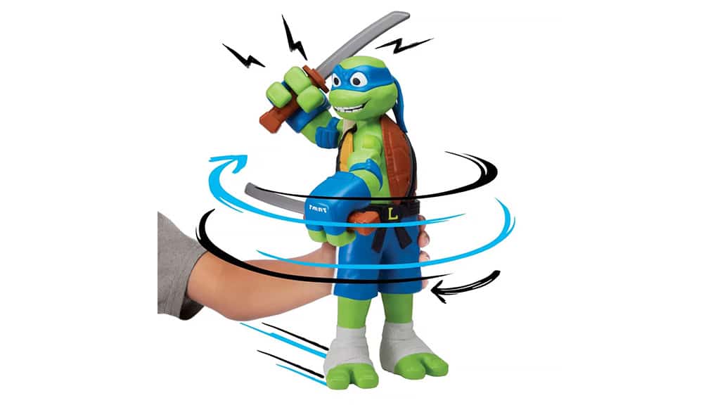 To je velika akcijska figura Zgodb o Ninja želvah, ki se vrti za 360 stopinj, ko jo potisnete po ravni površini, zahvaljujoč kolesom na dnu igrače. Ti liki imajo velike, premične roke, ki se zlahka upogibajo in zvijajo.