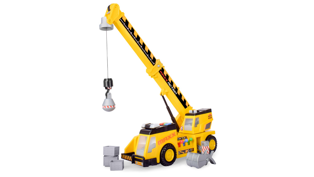 Sunny Days Entertainment Maxx Action 3-v-1 Žerjav Tovornjak ponuja 27-palčno gradbeno igro. Otroci lahko preprosto uporabljajo krmilne palice za dviganje, lomljenje in premikanje gradbenih kock! Žerjav tovornjak ima tri dodatke — žlico, kavelj in rušilno kroglo —, tako da se otroci lahko igrajo na različne načine. Žerjav tovornjak se vrti za 360 stopinj, dvigne do 30 palcev in se premika naprej-nazaj s pritiskom na gumb. Poleg tega ima utripajoče luči in realistične gradbene zvoke.