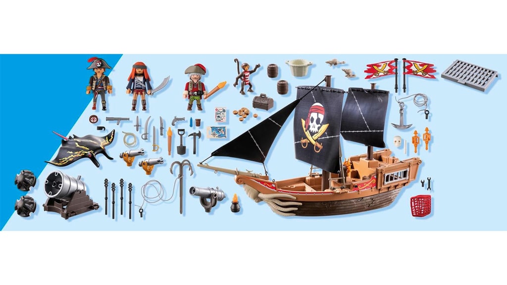 Playmobil Velika piratska ladja vsebuje številne elemente, ki jih lahko otroci uporabijo v vsaki kreativni, piratski tematski sceni. Velika ladja je opremljena s premičnimi jadri, jambori in topovi, ter s kavljem, skrinjo z zakladom, kompasom, baklami, lobanjami, zemljevidi, sabljami in še veliko več. Set vključuje tudi tri piratske figure, opico, morskega pošastnega raja in številne dodatke, ki jih otroci lahko uporabijo med domišljijsko igro.Otroci lahko med igro uporabljajo različne priložene dodatke. Ti dodatki omogočajo, da je igra še bolj vznemirljiva in ustvarjalna, saj lahko izmišljajo različne igre vlog in zgodbe. Med dodatki so na primer različne figure, vozila, stavbe in drugi pripomočki, ki vsi prispevajo k zabavni in poučni igralni izkušnji.