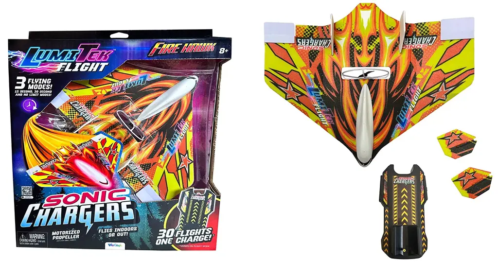 Otroci lahko ustvarijo dinamične zračne akrobacije s pomočjo **Sonic Chargers Fire Hawk** od **WeCool**. Napolnijo lahko Fire Hawk in z njim letijo znotraj ali **zunaj**. Vsebuje tri različne načine letenja, navpične stabilizatorje in priročnik, ki pomaga pri učenju izvajanja akrobacij.
