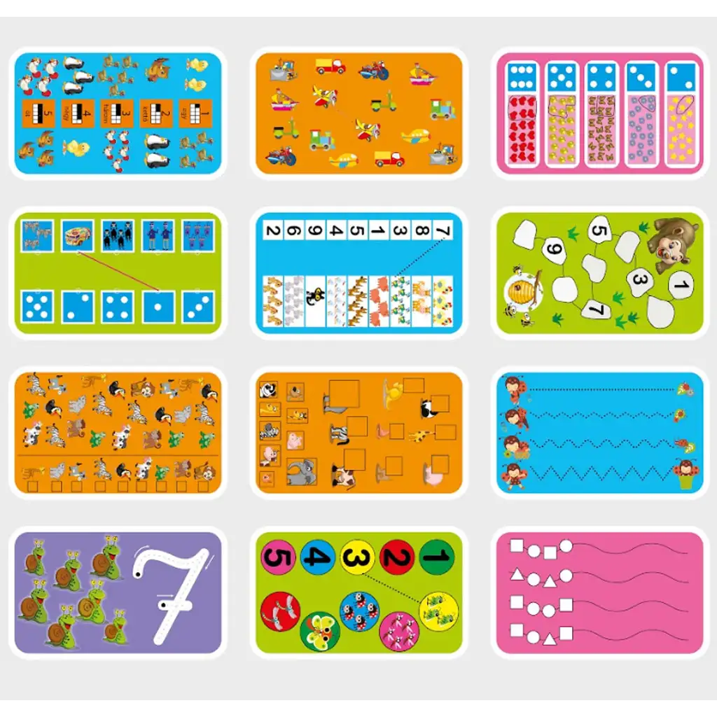 Paket vsebuje 12 dvostranskih, izbrisljivih kartic, ki ponujajo raznolike naloge. Otroci lahko na primer izvajajo ujemanja, vaje za sledenje črtam, urejajo številčne vrste in rešujejo preproste matematične operacije. S priloženim izbrisljivim flomastrom je mogoče naloge znova in znova reševati, kar ohranja komplet zanimiv na dolgi rok.