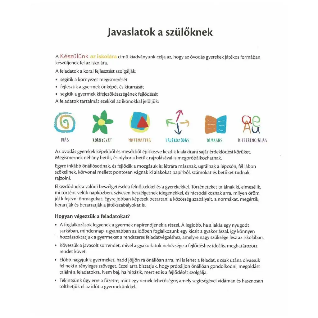 Za starše publikacija ponuja koristne nasvete, kako te vaje vključiti v vsakodnevno rutino otrok. Naloge se postopoma težijo, da otroke korak za korakom uvedejo v svet šolskih zahtev. Tako lahko otroci samozavestno in pripravljeno začnejo svojo šolsko pot.