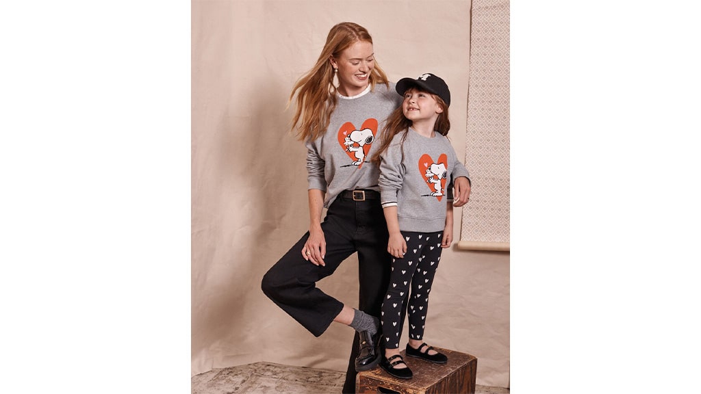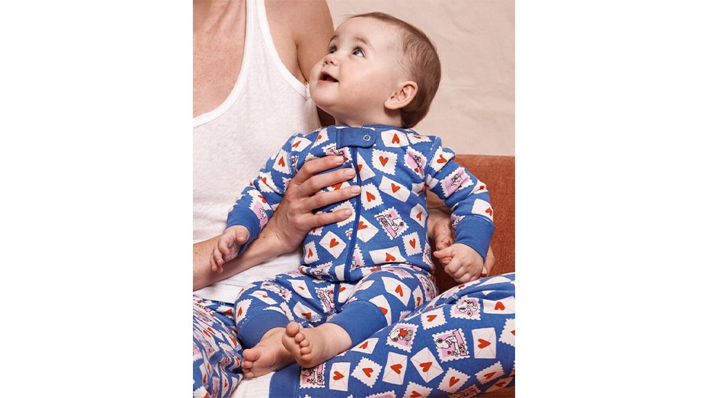 Vsa družina lahko deli ljubezen s pižamami, okrašenimi z motivom Peanuts, polnimi ljubezenskih pisem, znamk in Snoopija, na modrem rebrastem pletenem materialu. Otroci lahko ostanejo topli z Long John kompletom, medtem ko lahko dojenčki nosijo 2-smerni Zip Sleeper, ki je na voljo za "dojenčke" do 3 let. Tudi starši lahko uživajo v zabavi z "Peanuts Valentinovo Long John pižama hlačami"!