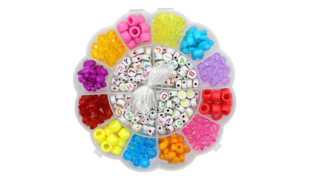 Barvita zbirka kroglic v škatli v obliki rože, ta komplet zagotavlja 270 različnih kosov za ustvarjalne projekte nakita za otroke. Vsebuje tudi vrvice, ki omogočajo vsestranske ročne možnosti, kot so zapestnice, gležnarji, ogrlice ter okrasitev ročno izdelanih kartic in torb.