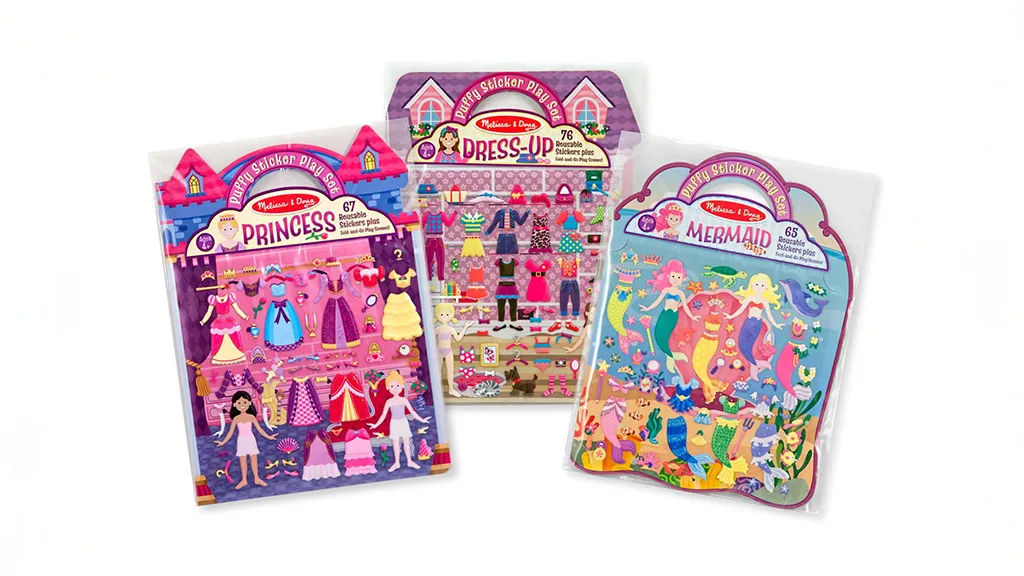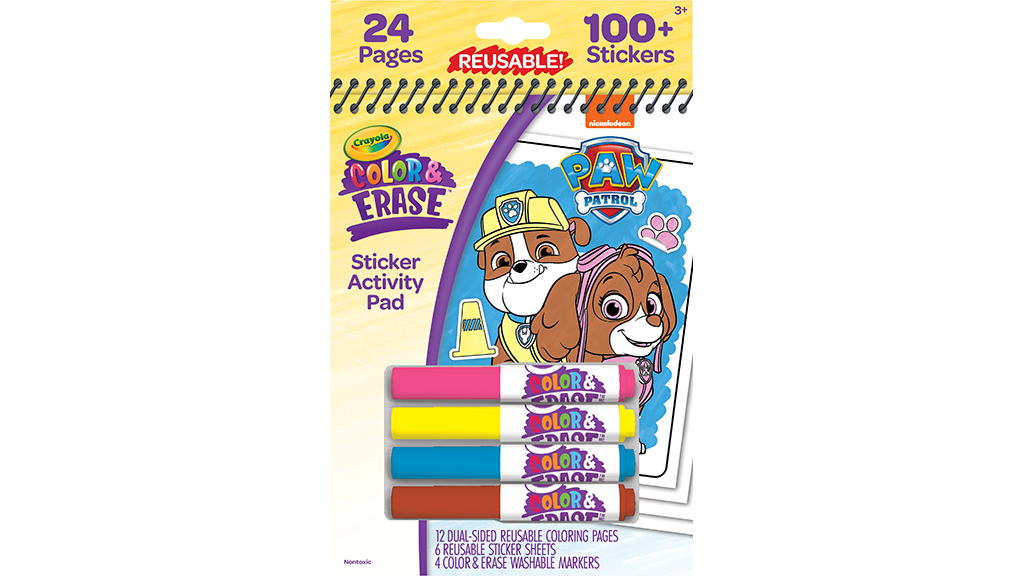 Ti potovalni delovni zvezki vsebujejo 24 večkrat uporabnih strani za barvanje, štiri pralne flomastre in več kot 100 večkrat uporabnih nalepk. Izbirate lahko med knjigami s tematiko Tačke na patrulji in Troli. Ti zvezki so idealni za dolga potovanja, saj se otroci z njimi lahko zamotijo ure in ure. Zahvaljujoč pralnim flomastrom so po barvanju enostavno čistljivi, zato staršem ni treba skrbeti za nered. Več kot 100 večkrat uporabnih nalepk pa omogoča kreativno igro in pripovedovanje zgodb.