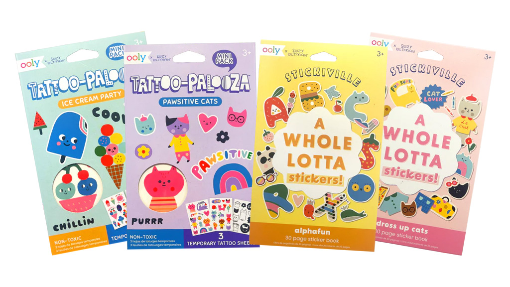 Umetnica in ilustratorka Suzy Ultman je oblikovala te nalepke in začasne tetovaže. Ne glede na to, ali otrok želi ustvarjati z mačkami ali si želi tetovažo sladoleda, ta zbirka vsebuje ustrezno knjigo z nalepkami ali paket začasnih tetovaž zanje! Živahne barve in podrobni vzorci nalepk in tetovaž zagotovo pritegnejo pozornost in ustvarjalnost otrok. Popolna izbira za rojstnodnevno darilo ali katero koli posebno priložnost.