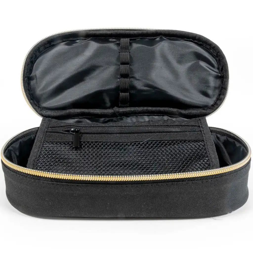 Praktična notranja zasnova omogoča lažjo organizacijo: vsebuje zadrgo z mrežastim predalom za manjše dodatke (npr. radirka, šilček) in elastične trakove za pritrditev svinčnikov in pisal. Dvojna zadrga omogoča enostavno odpiranje in zapiranje, zato jo lahko brez težav uporabljajo tudi manjše roke. Izdelana je iz trpežnega materiala, ki dobro prenaša vsakodnevno uporabo – naj bo to v šoli, na likovnem krožku ali za učenje doma.