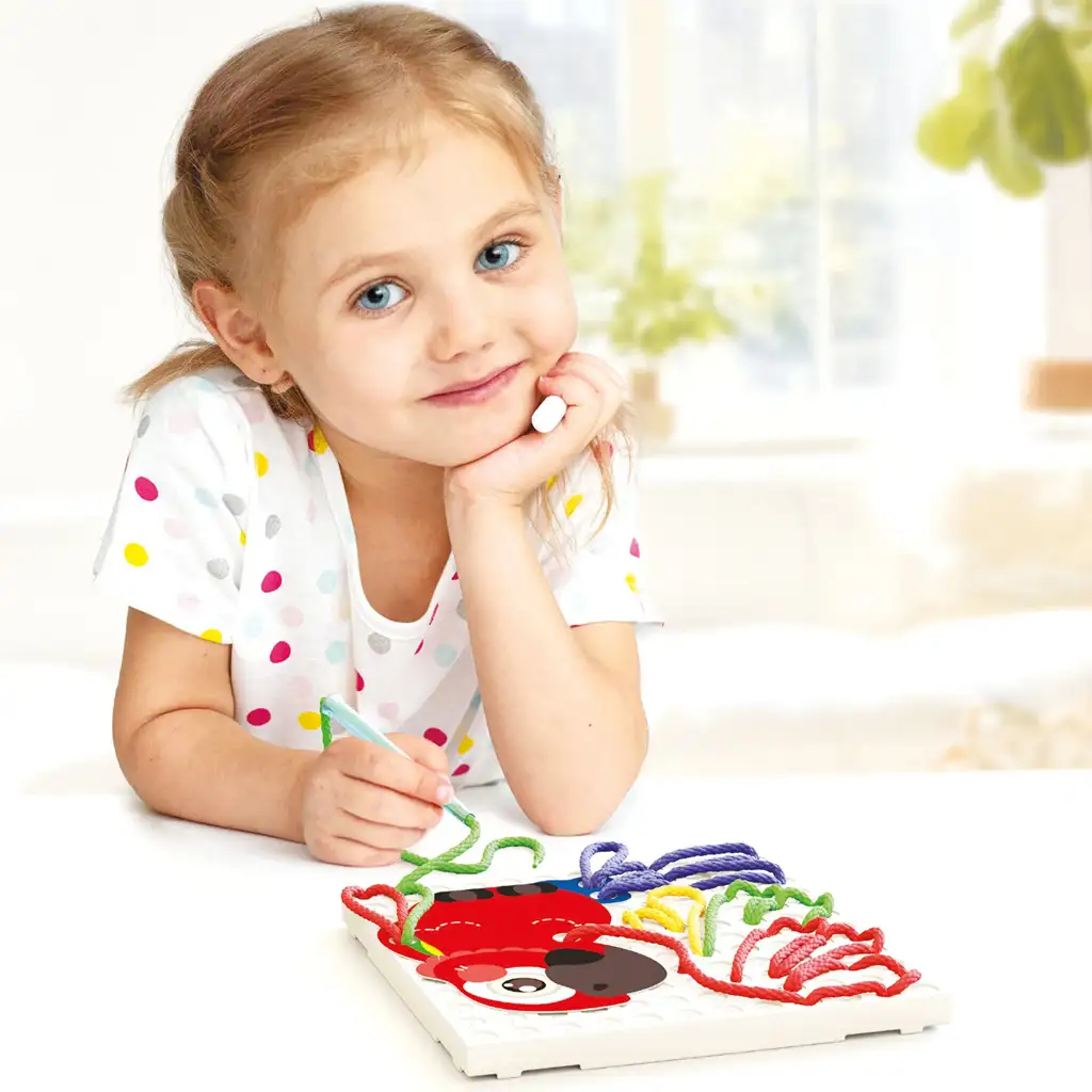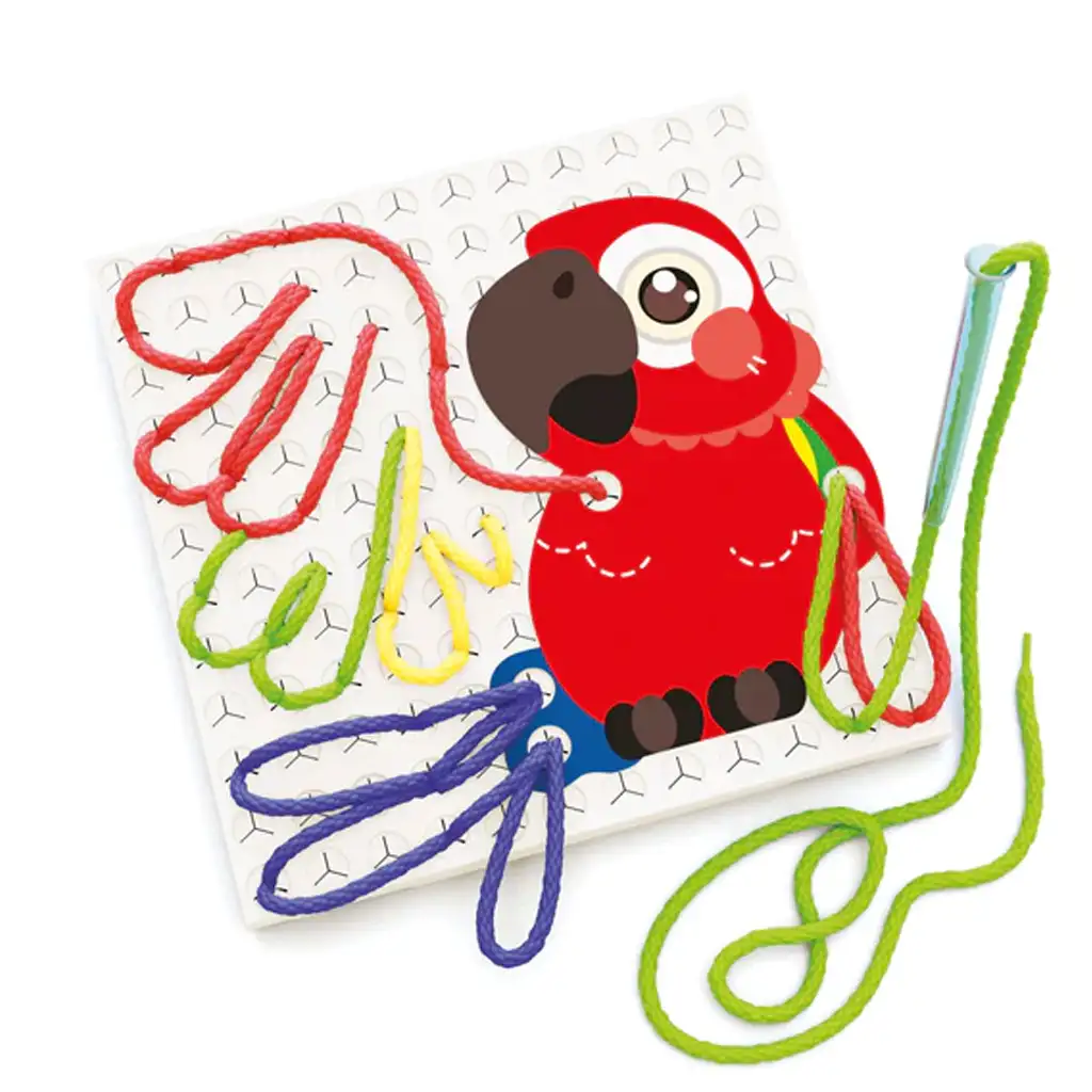 Bistvo igre je, da predloge postavite na ploščo z luknjami, nato pa nitke prepletate skozi luknje v predlogah, s čimer obrisujete predloge. Ta komplet vsebuje vzorce, povezane z živalmi, tako da lahko najdete žirafo, črva in papigo.