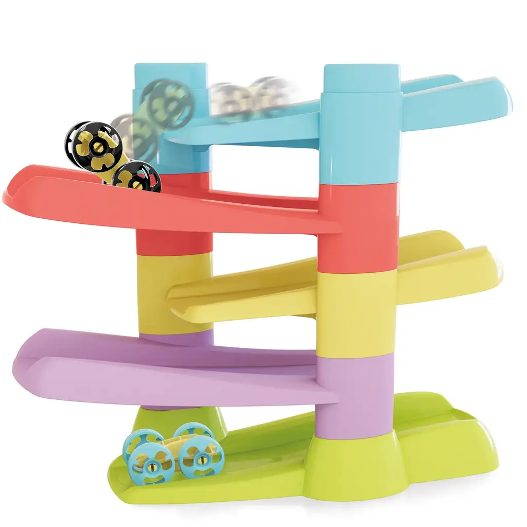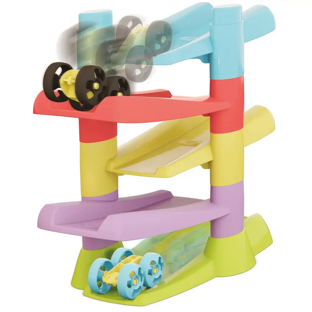 Stolp vodi majhne flip avtomobilčke skozi 5 nadstropij, pri čemer se na koncu vsakega klanca avtomatsko prevrnejo in nadaljujejo svojo vožnjo navzdol. To "flip" gibanje ni le atraktivno, ampak otrokom pomaga razumeti vzročno-posledične povezave, hkrati pa jih spodbuja k ponavljanju, eksperimentiranju in odkrivanju.